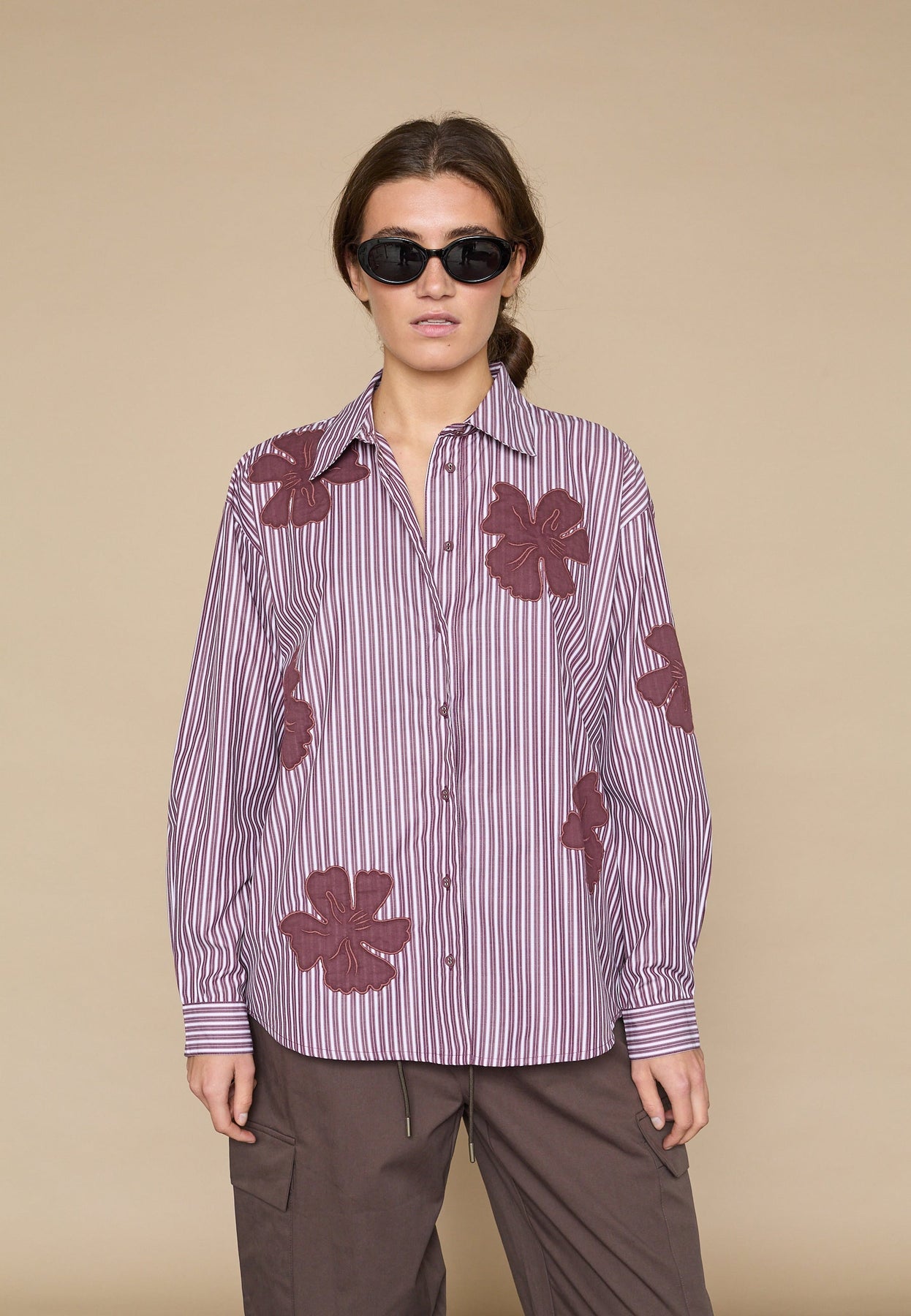 Gestreepte blouse van Love & Divine met grote bloemenapplicaties in bordeaux. De blouse heeft een klassieke kraag en knoopsluiting.