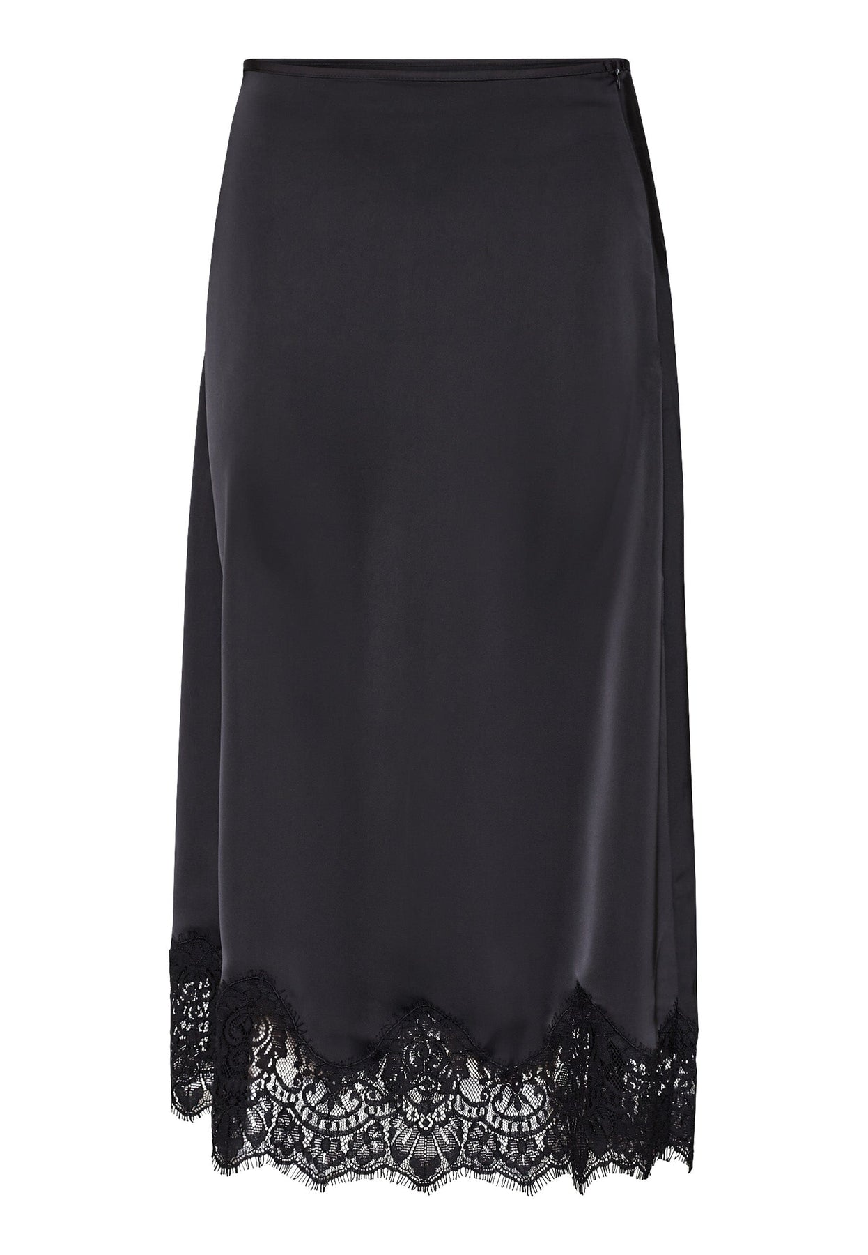 Zwarte rok van Love & Divine met kant langs de rand. De rok heeft een glad oppervlak met een licht glanzende finish en valt tot halverwege de kuit.