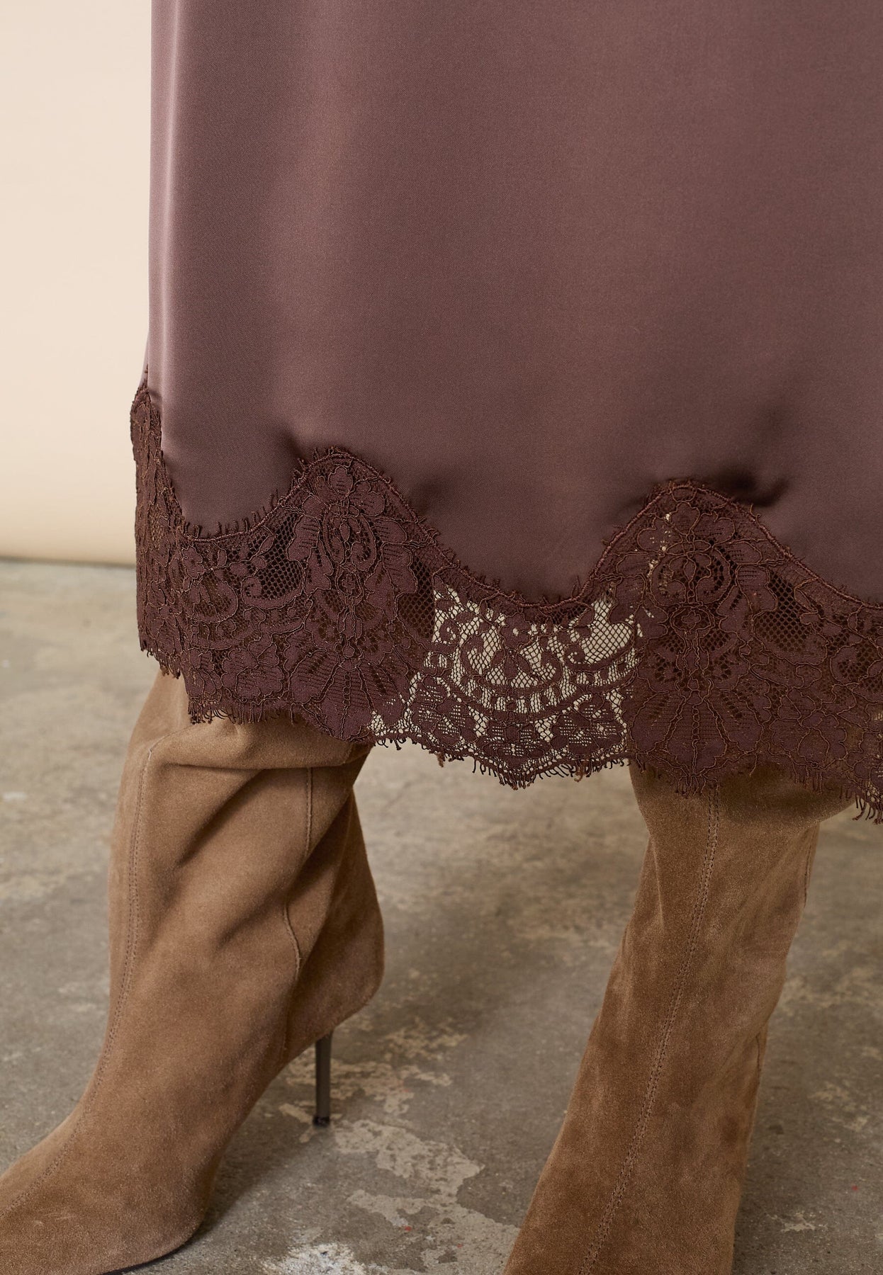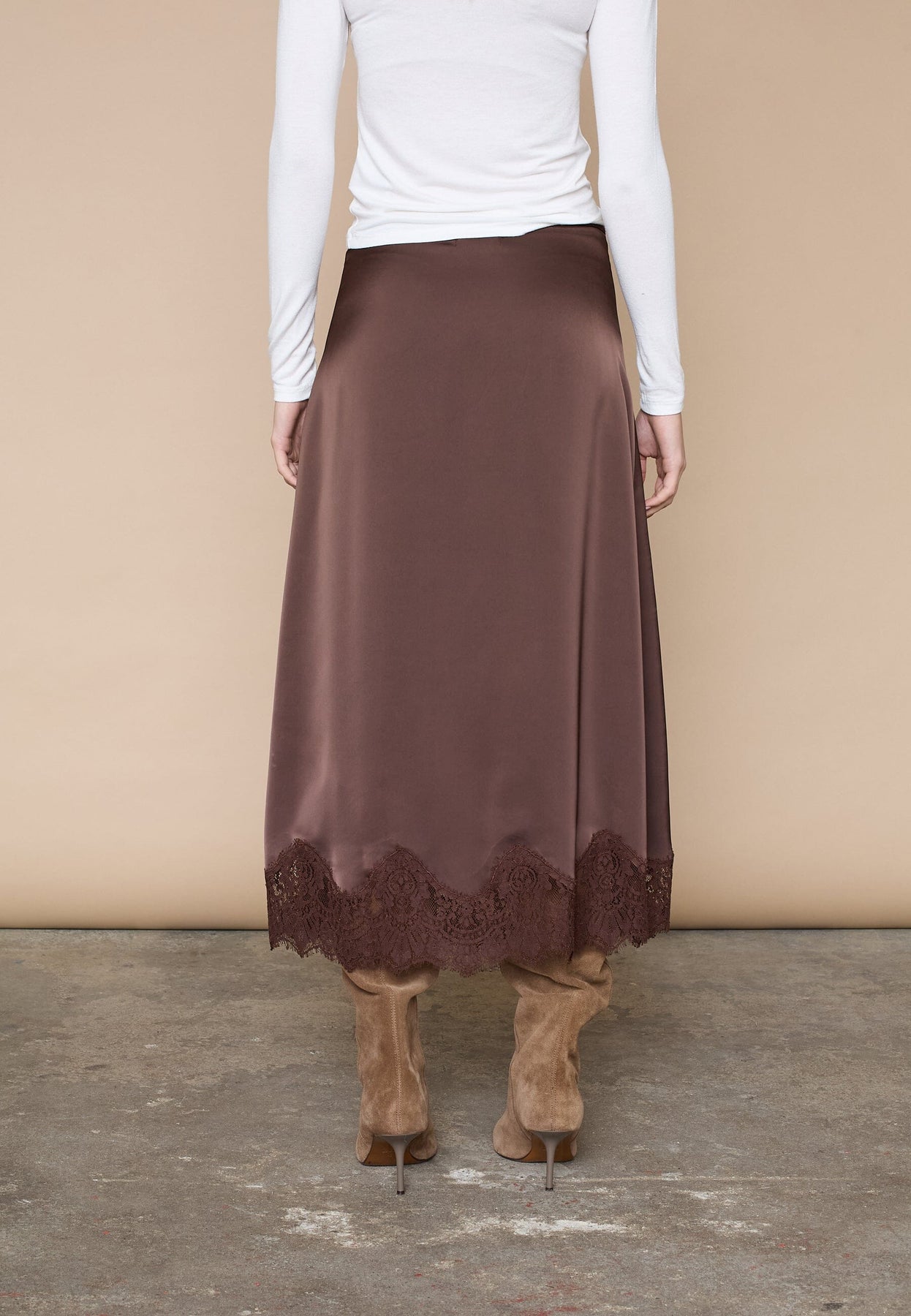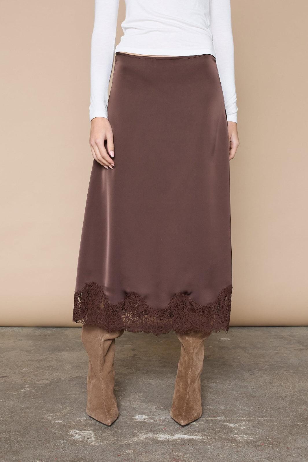 Bruine rok van Love & Divine met kanten rand. De rok heeft een glad oppervlak en een A-lijn model dat een subtiele vorm geeft.