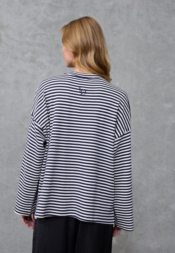 Gestreepte blouse van Love & Divine in crème en donkerblauw. De blouse is gemaakt van 100% katoen en heeft een klassiek gestreept patroon met borduurdetails.