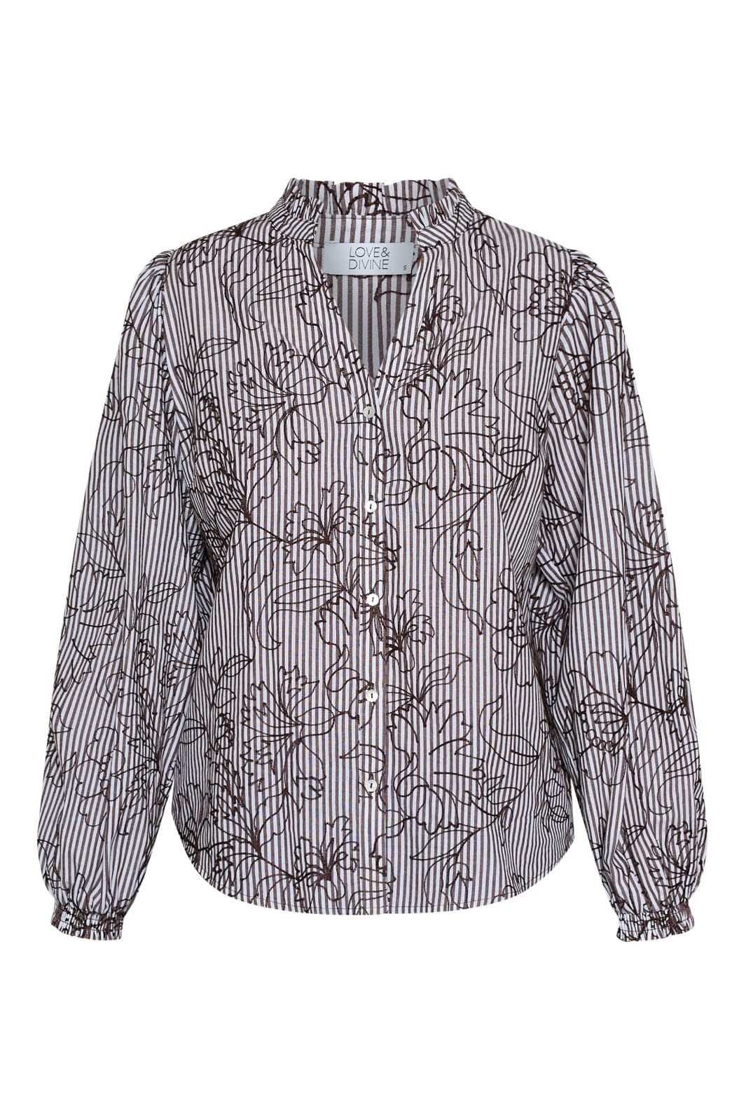 Blouse van Love & Divine met bruine en witte strepen met daaroverheen een bloemenpatroon. Ze heeft een V-hals met een kleine gerimpelde kraag.