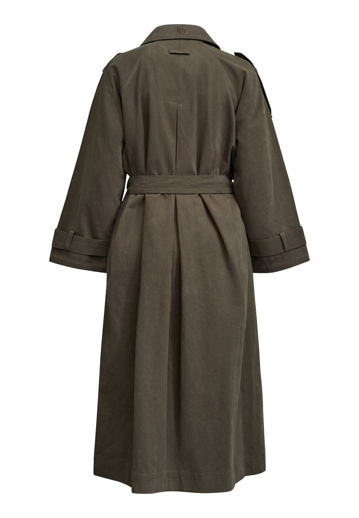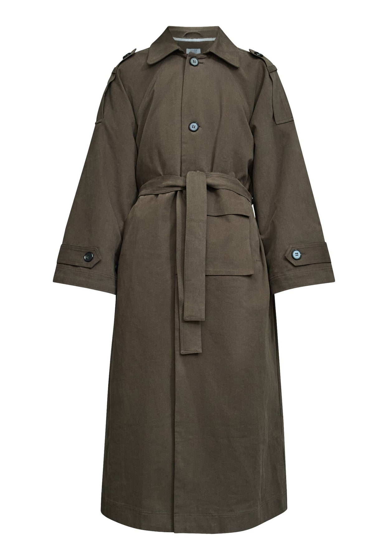 Bruine jas van Love & Divine, gemaakt van 100% katoen. De jas heeft een lang model met knopen aan de voorkant en een strikceintuur in de taille.