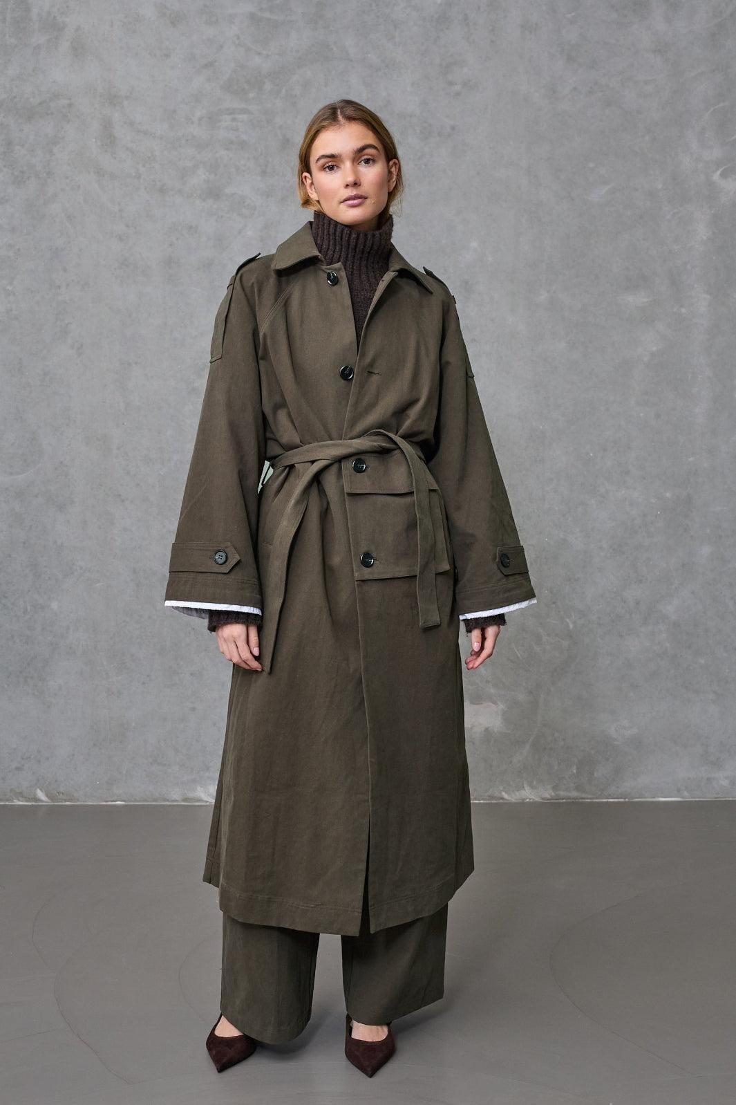 Bruine jas van Love & Divine, gemaakt van 100% katoen. De jas heeft een lang model met knopen aan de voorkant en een strikceintuur in de taille.