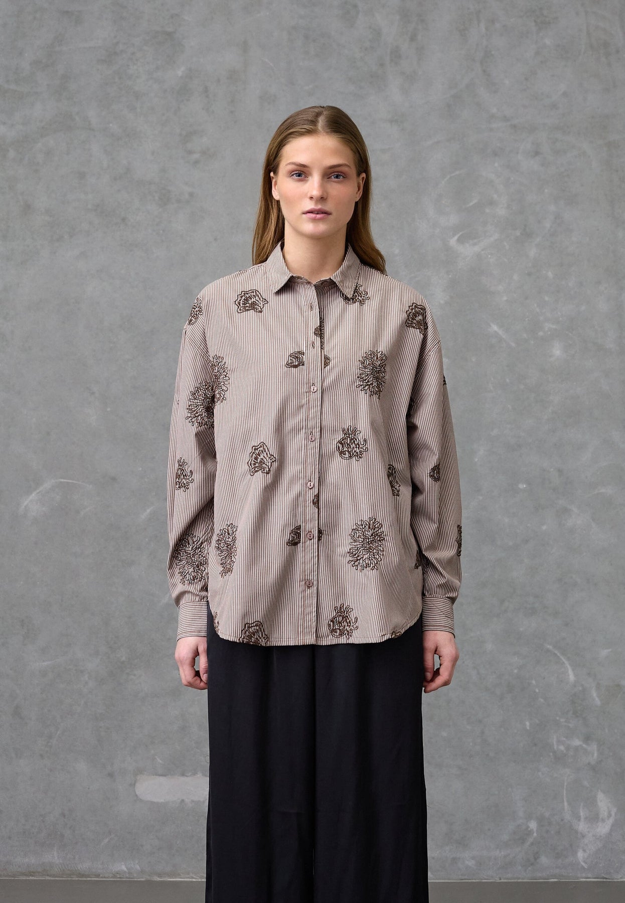 Bruingestreept shirt van Love & Divine, gemaakt van 100% katoen. Het shirt heeft een paisleypatroon met borduursel op de bruine strepen.