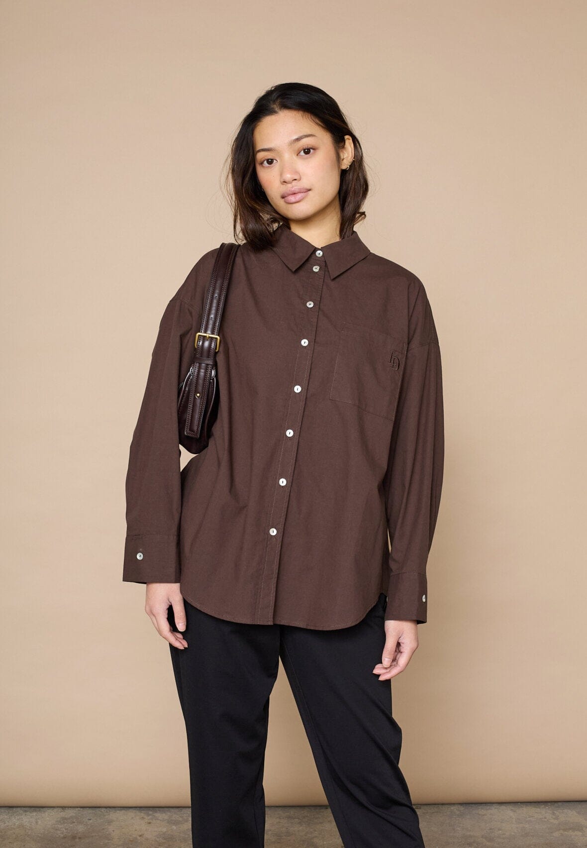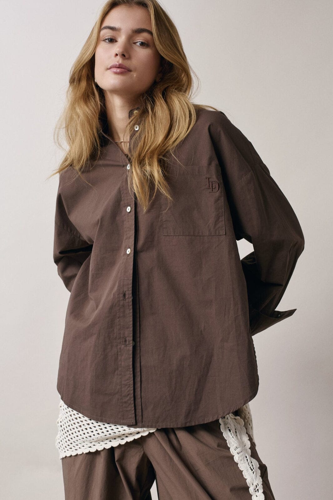 Bruin overhemd van Love & Divine met borduursel op de borstzak. Het overhemd heeft een oversized pasvorm, lange mouwen en een knoopsluiting aan de voorkant.