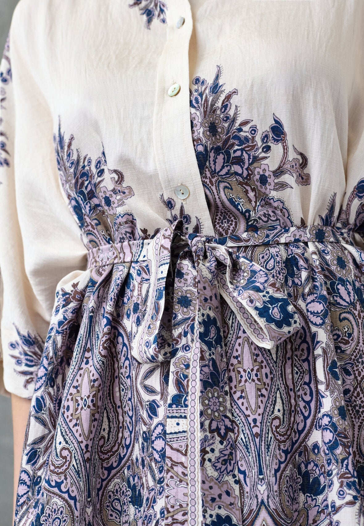 Jurk van Love & Divine in crème en wit met paisleypatroon in champagne en blauw. De jurk heeft een knoopsluiting aan de voorkant en 3/4-mouwen.