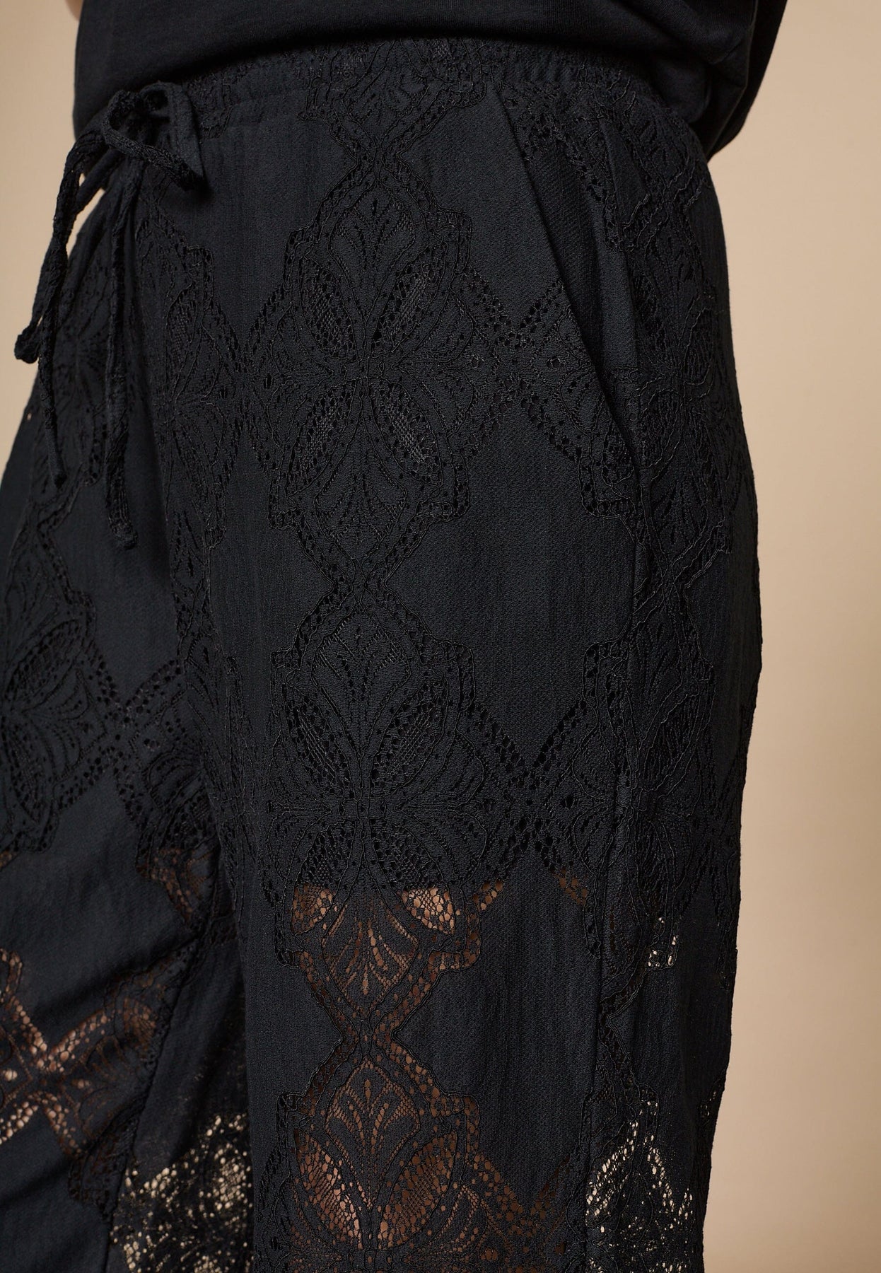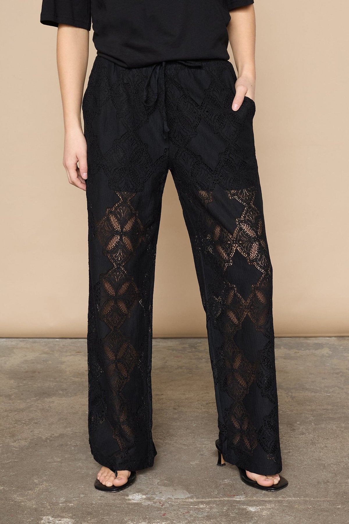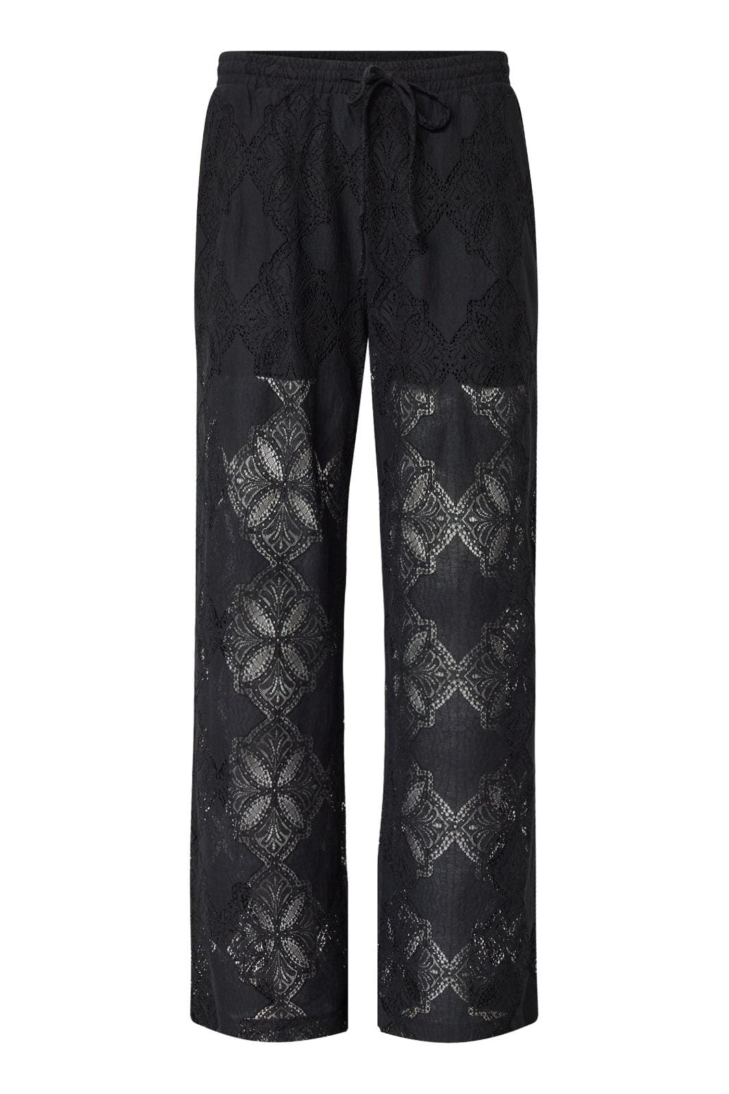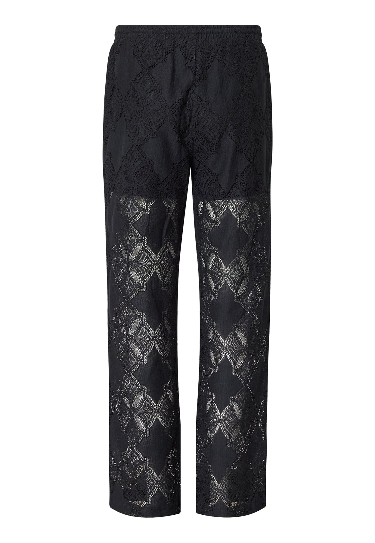 Zwarte broek van Love & Divine met een transparant kantpatroon. De broek heeft een normale taillehoogte en valt tot op de enkel.