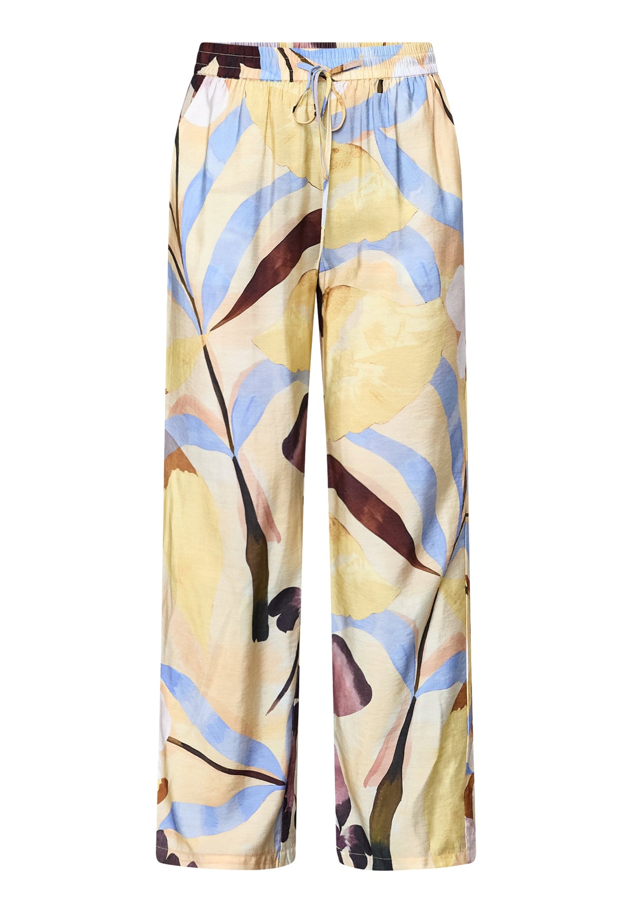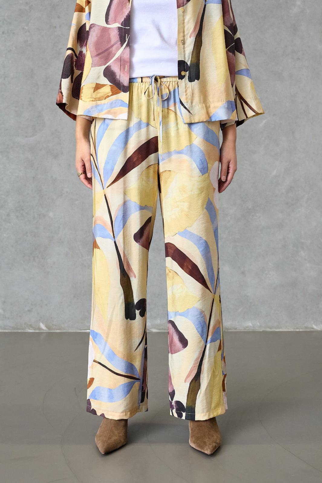 Broek van Love & Divine met een bloemenpatroon in gele, blauwe, bruine en paarse tinten. De broek heeft een losse pasvorm en valt tot op de enkel.