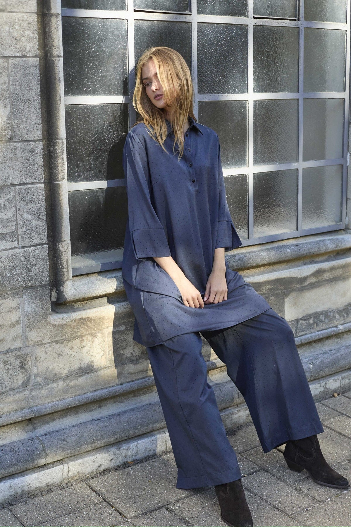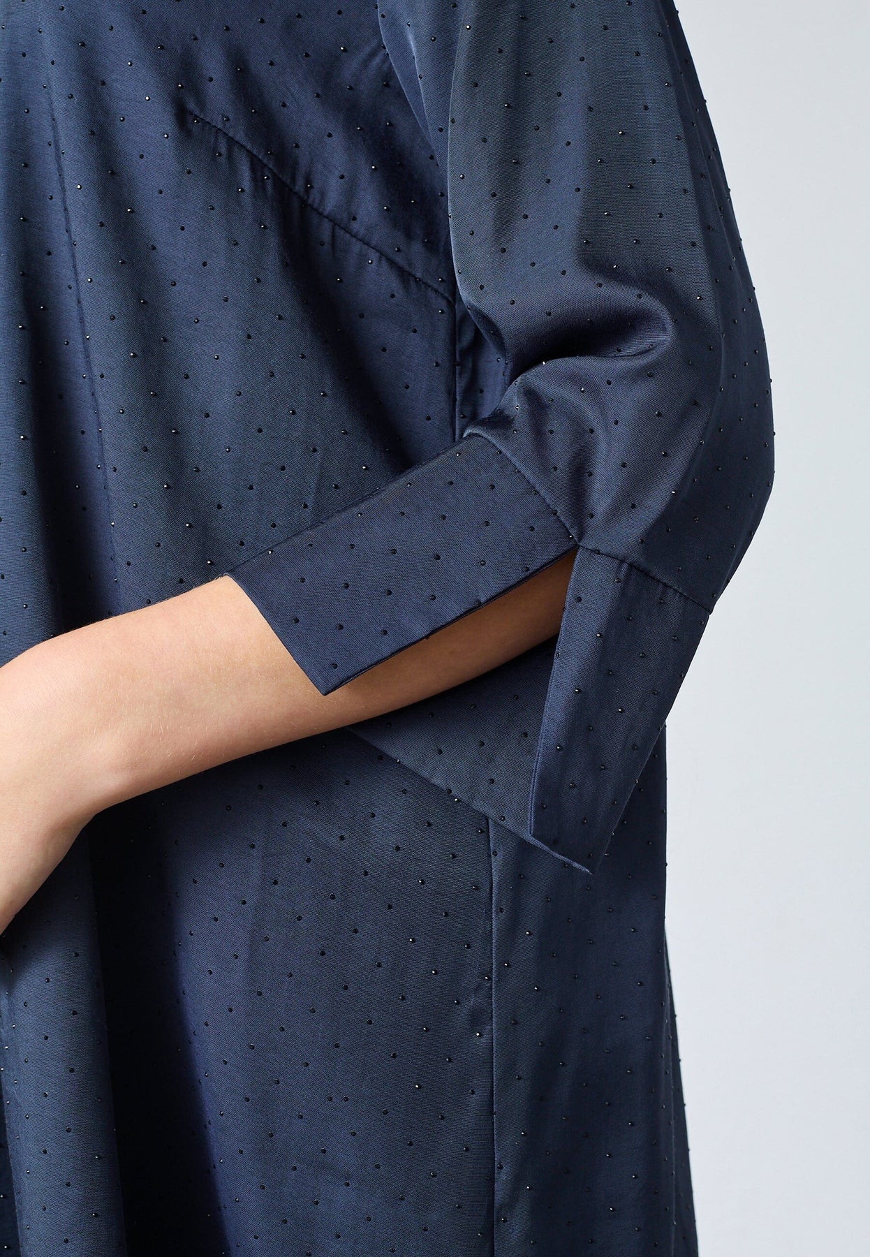 Donkerblauwe jurk van Love & Divine met een subtiel stippenpatroon. De jurk heeft een overhemdkraag en driekwartmouwen met brede manchetten.