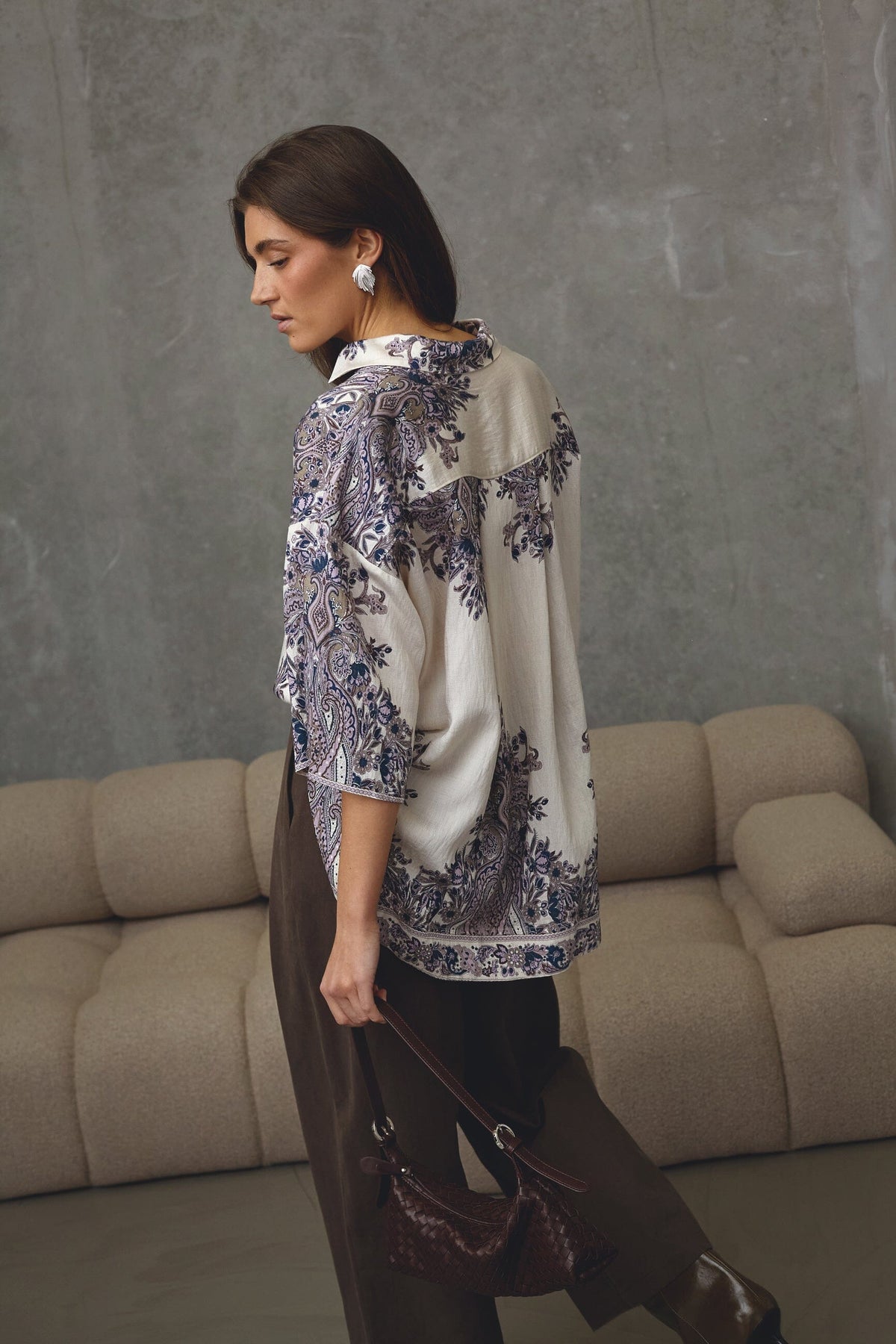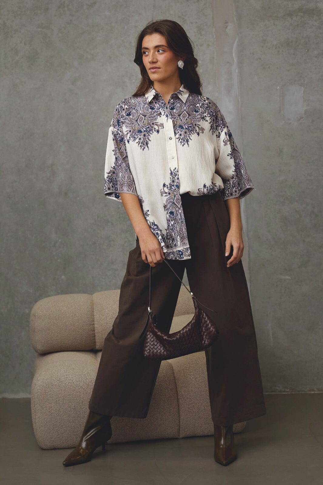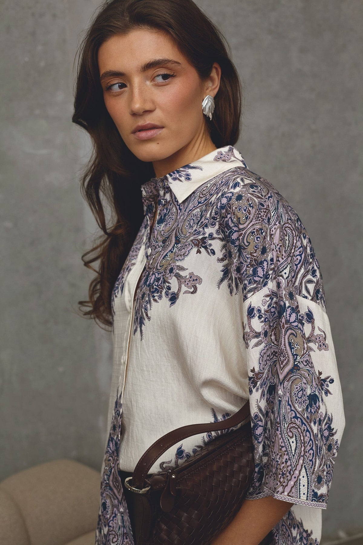 Blouse van Love & Divine met een gedetailleerd paisleypatroon in champagne en blauw. De blouse heeft een losse pasvorm en mouwen tot aan de elleboog.