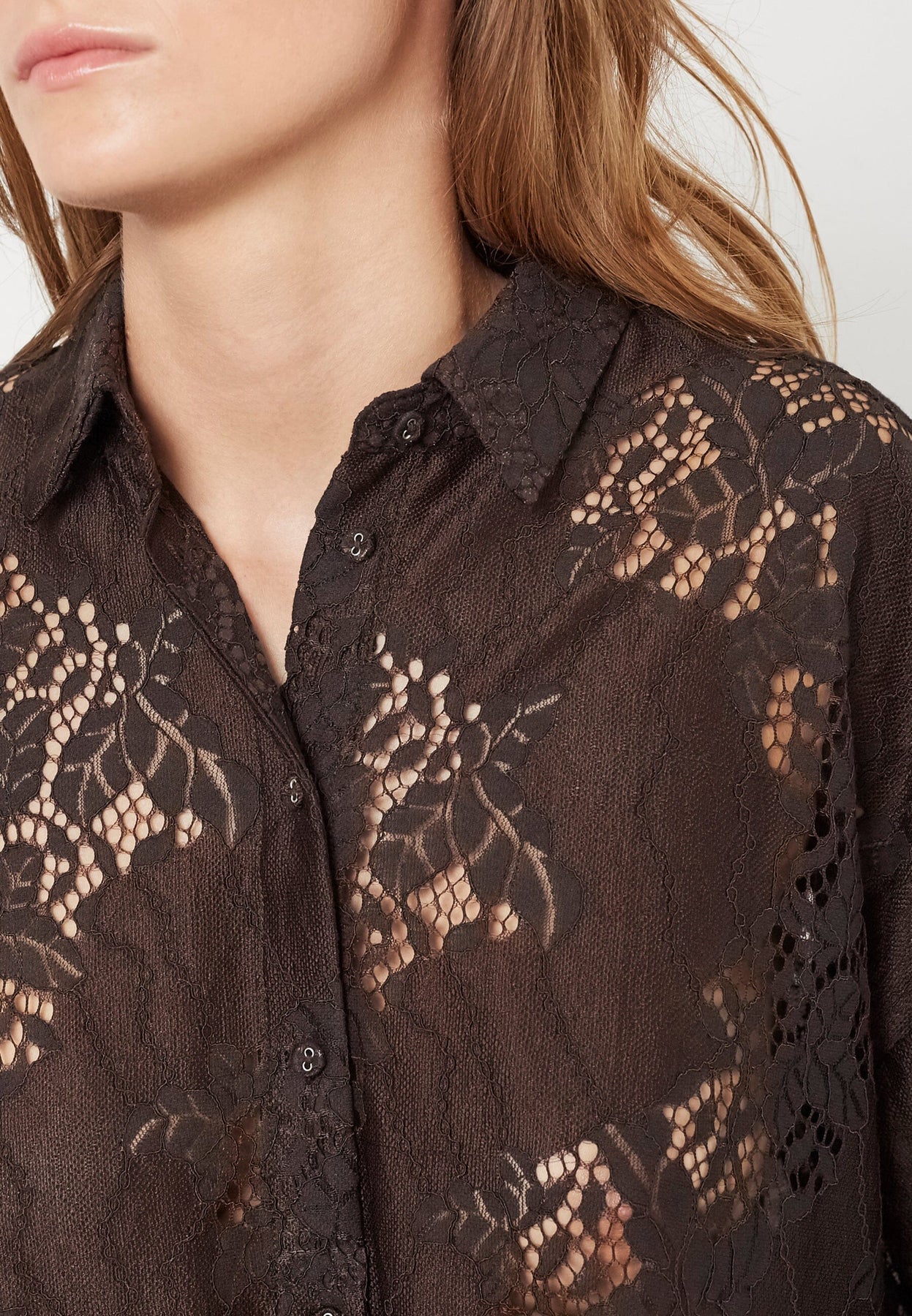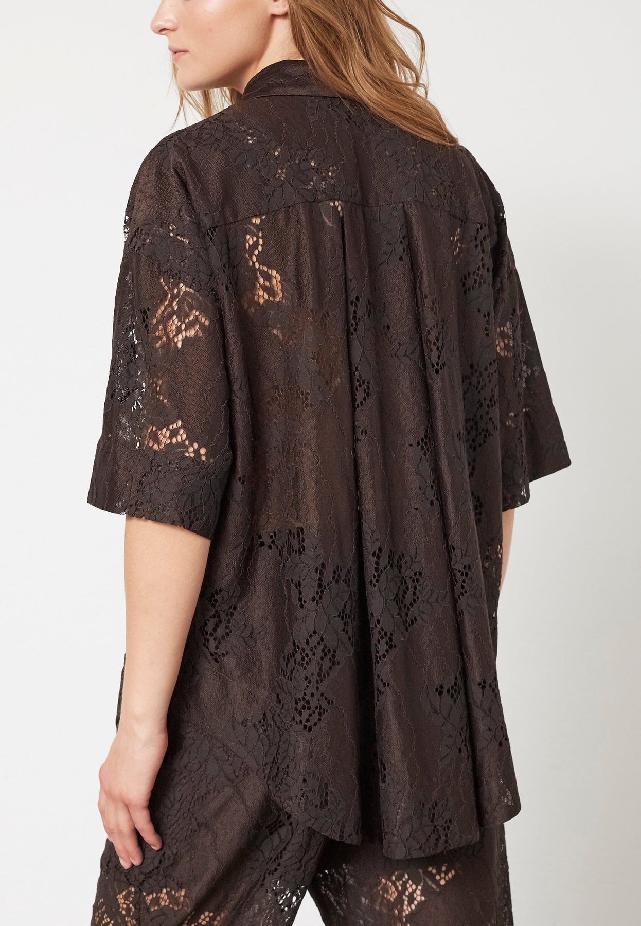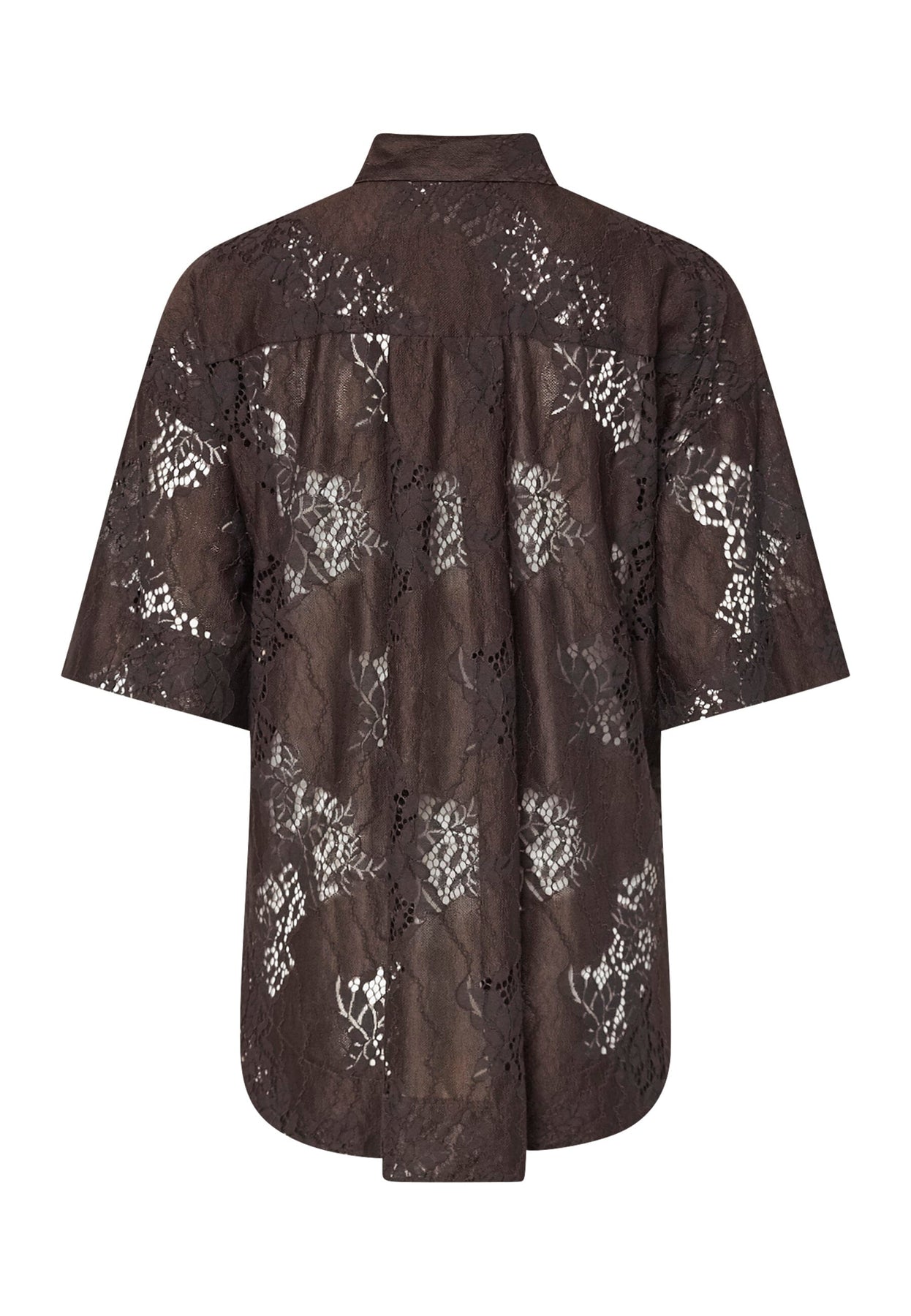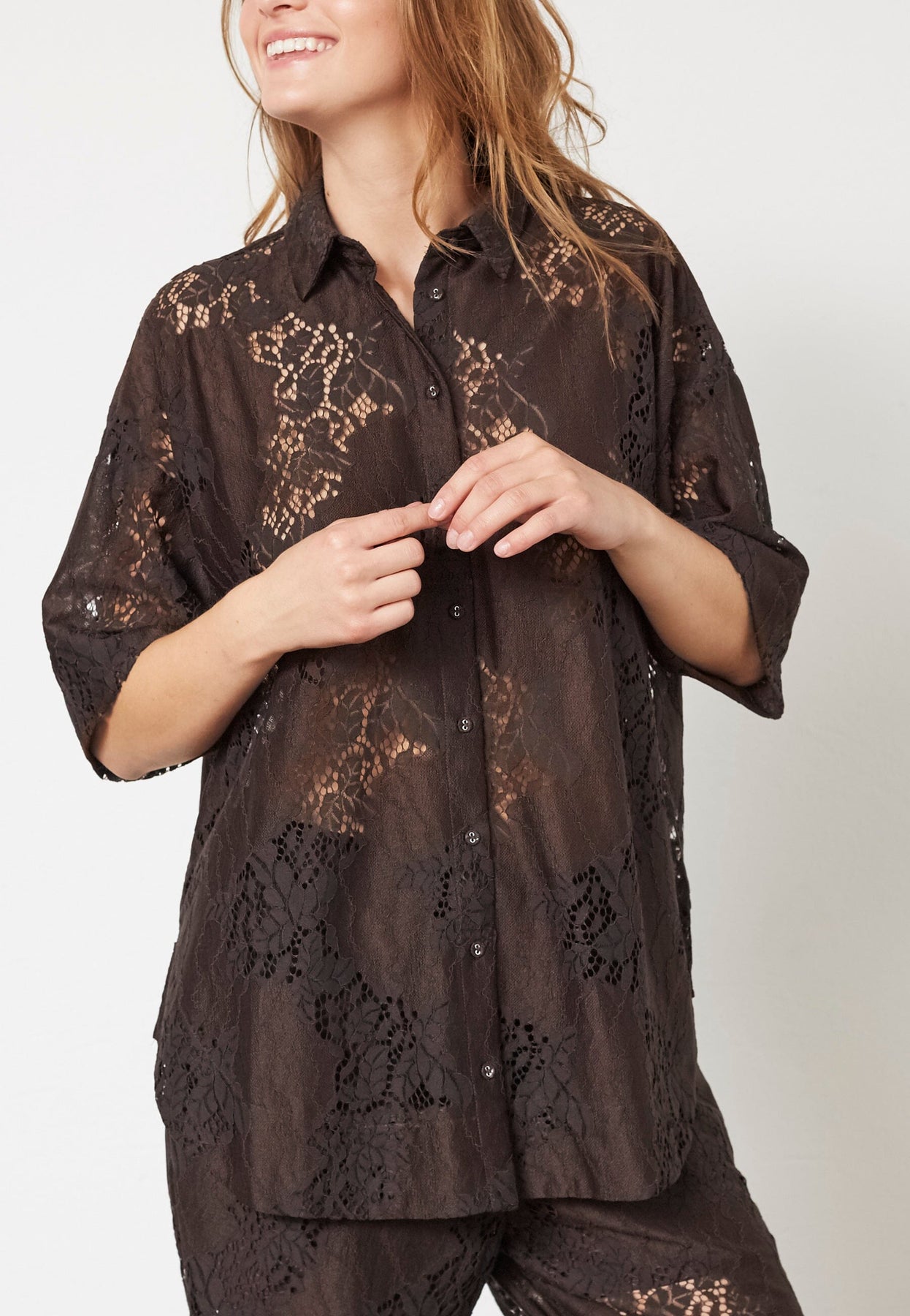 Donkerbruine blouse van Love & Divine met kant. De blouse heeft een losse pasvorm, korte mouwen en een klassieke overhemdkraag met knoopsluiting aan de voorkant.