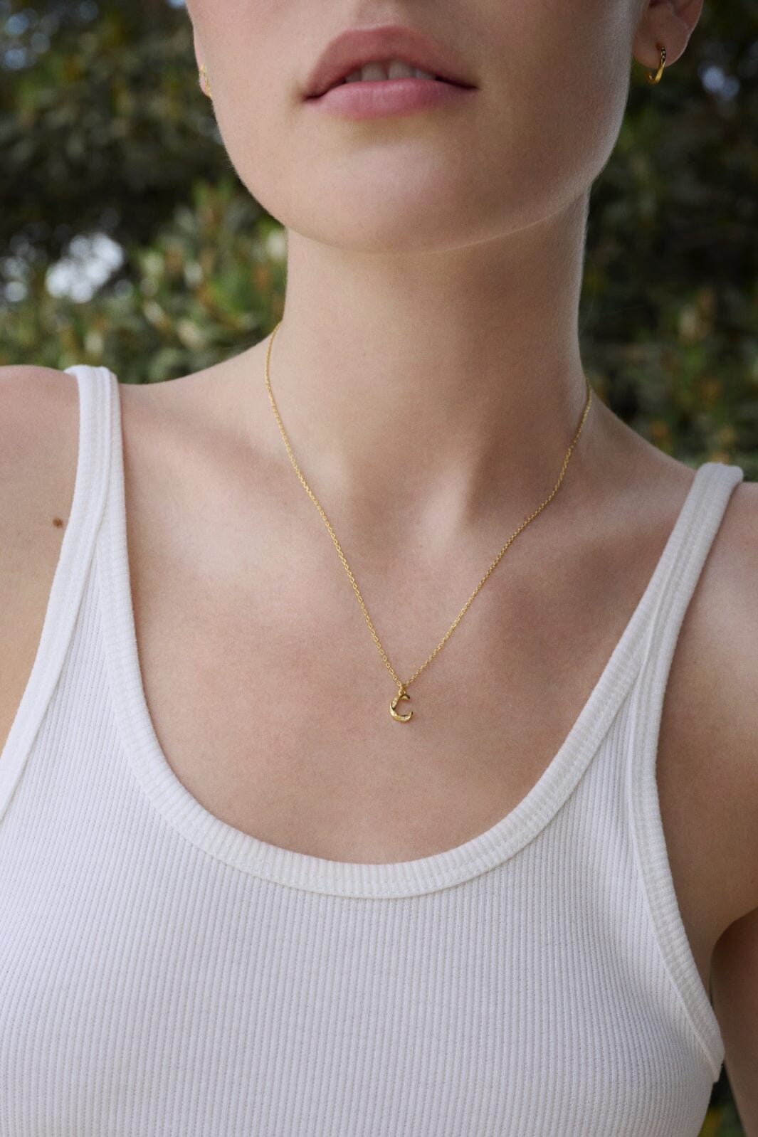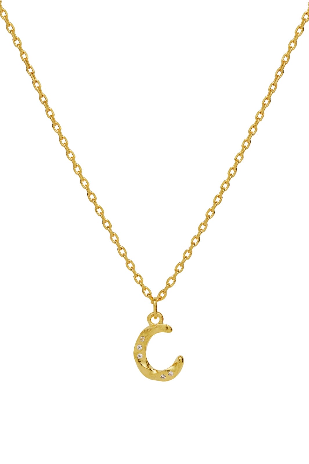 Goudplatede halsketting van Maanesten met een C-vormige hanger. De hanger heeft kleine stenen ingelegd en hangt aan een gouden ketting met verstelbare lengte.