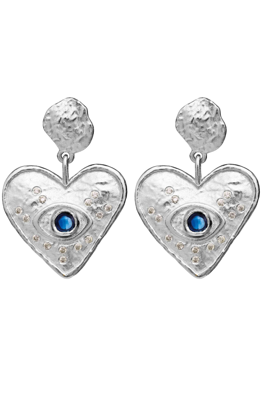 Zilveren oorbellen van Maanesten met hartvormig ontwerp en blauwe steen in het midden. De oorbellen hebben een decoratief oogmotief en zijn versierd met kleine, heldere stenen rondom de blauwe centersteen.
