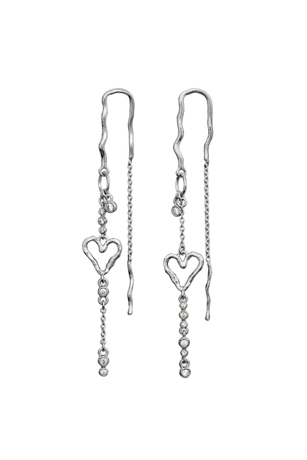 Lange oorbellen van Maanesten met een hartvormig design en kleine ronde details aan de kettinkjes. Gemaakt van gerecycled sterlingzilver en verguld met 18 karaat goud.