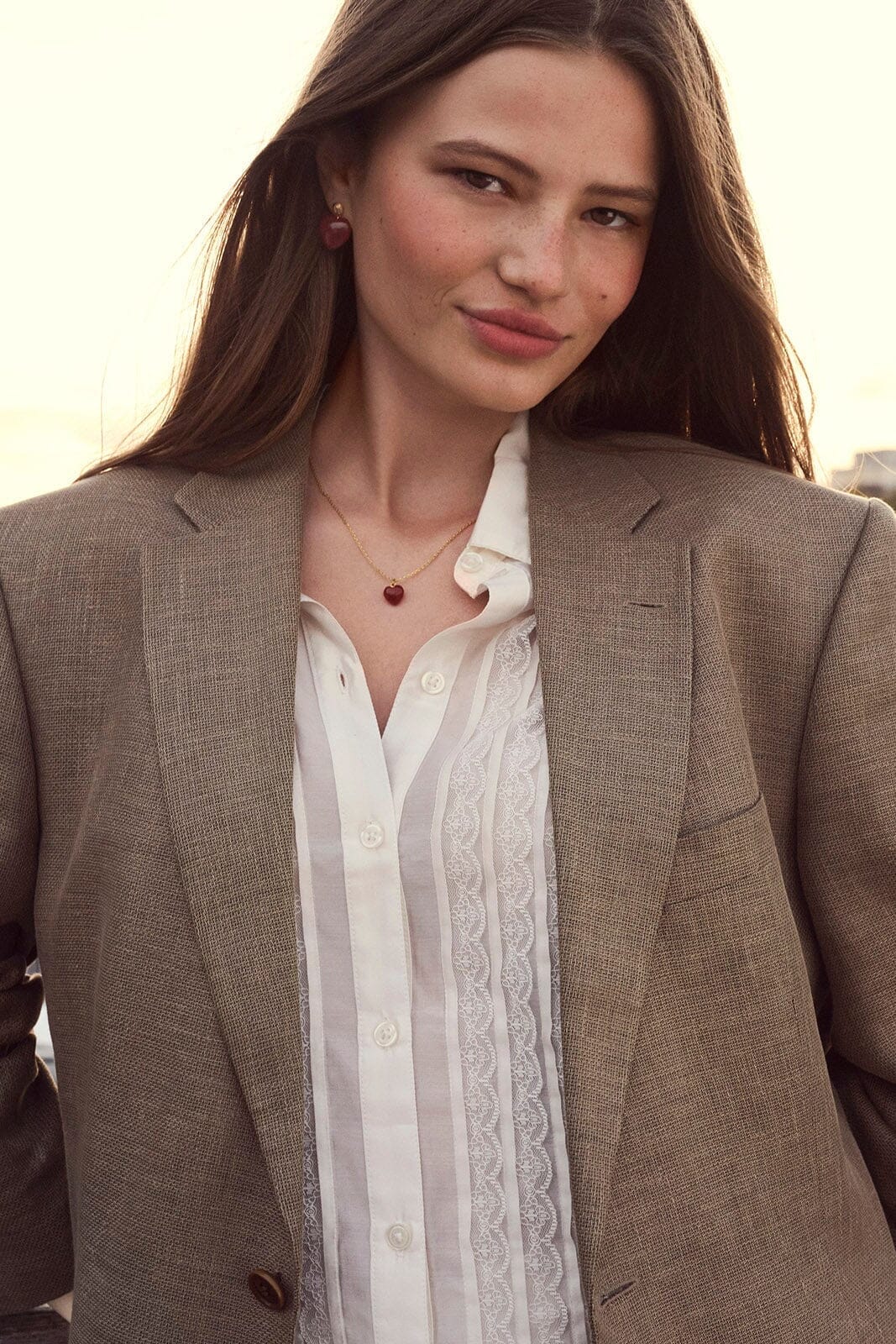 Ketting van Maanesten met een hartvormige hanger in een diep rode kleur. Gemaakt van gerecycled sterlingzilver, verguld met 18-karaats goud. De ketting heeft kleine schakels en is ontworpen om dicht op het lichaam te dragen.