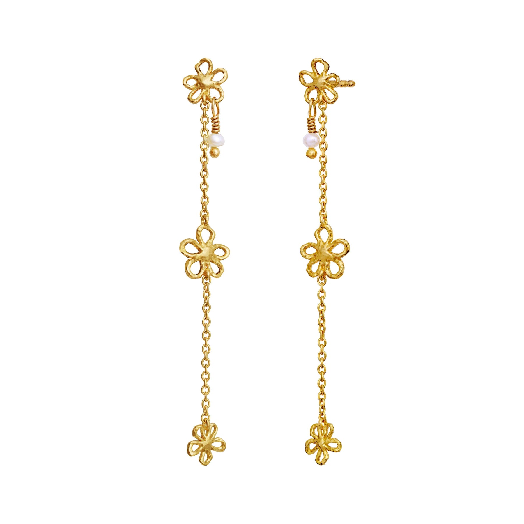 Lange oorbellen van Maanesten met bloemmotieven en kleine parels. Het ontwerp is geïnspireerd op de zomers uit de kindertijd en heeft een nostalgische uitstraling.