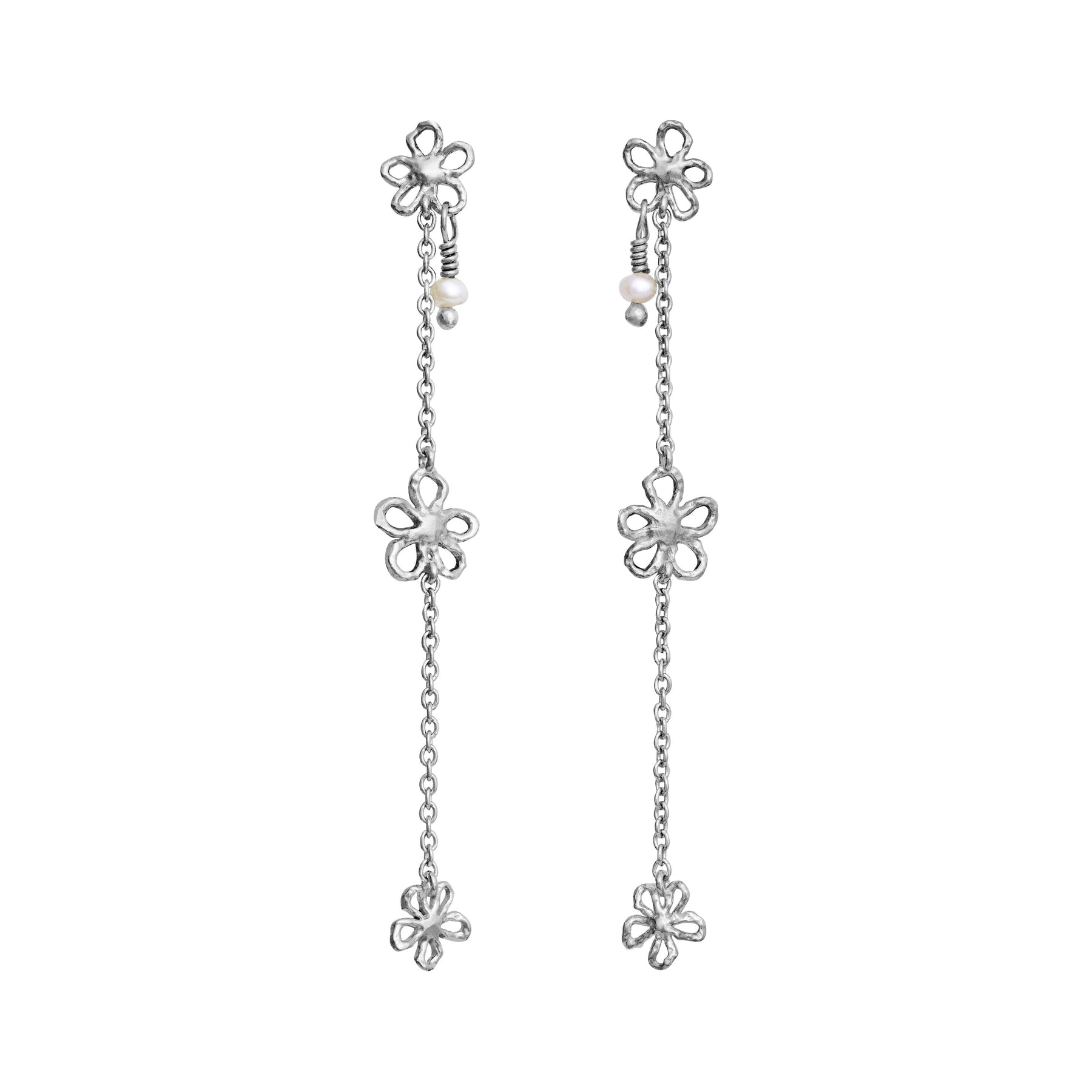 Oorbellen van Maanesten met een bloemendesign en kettingelementen in zilver. Het ontwerp heeft een nostalgische uitstraling, geïnspireerd op zomers uit de kindertijd.