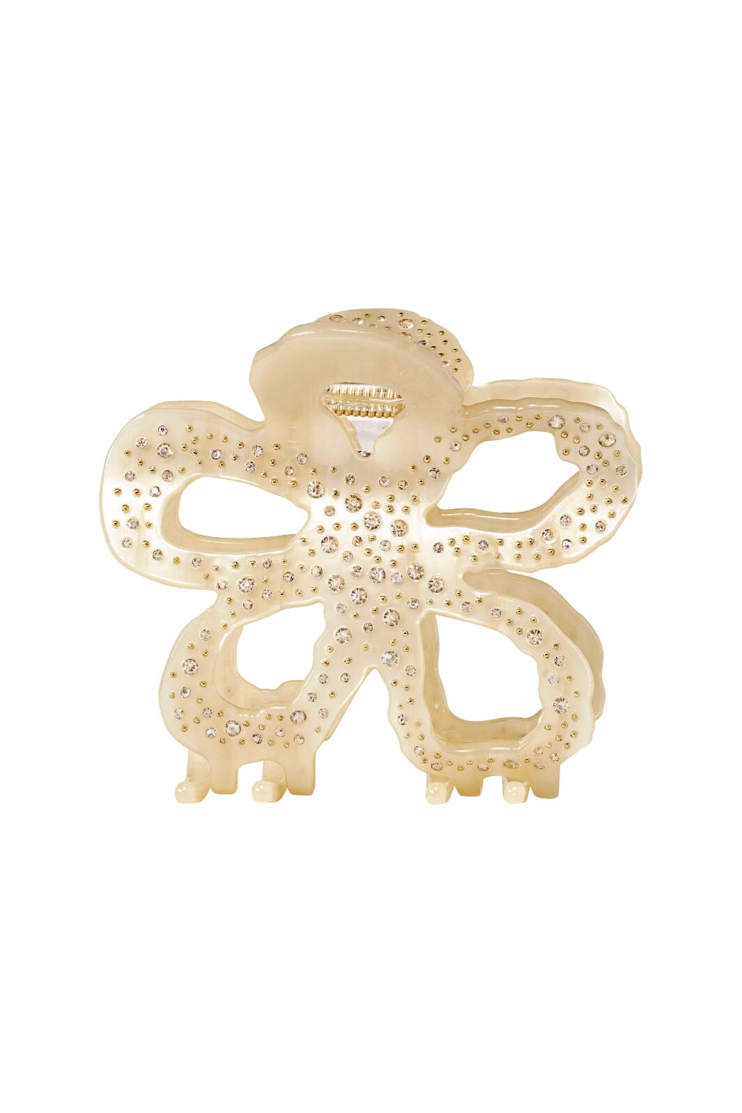 Haarclip van Maanesten in bloemvorm met een lichte, parelmoerachtige kleur in wit en crème. Hij is versierd met kleine, heldere steentjes.