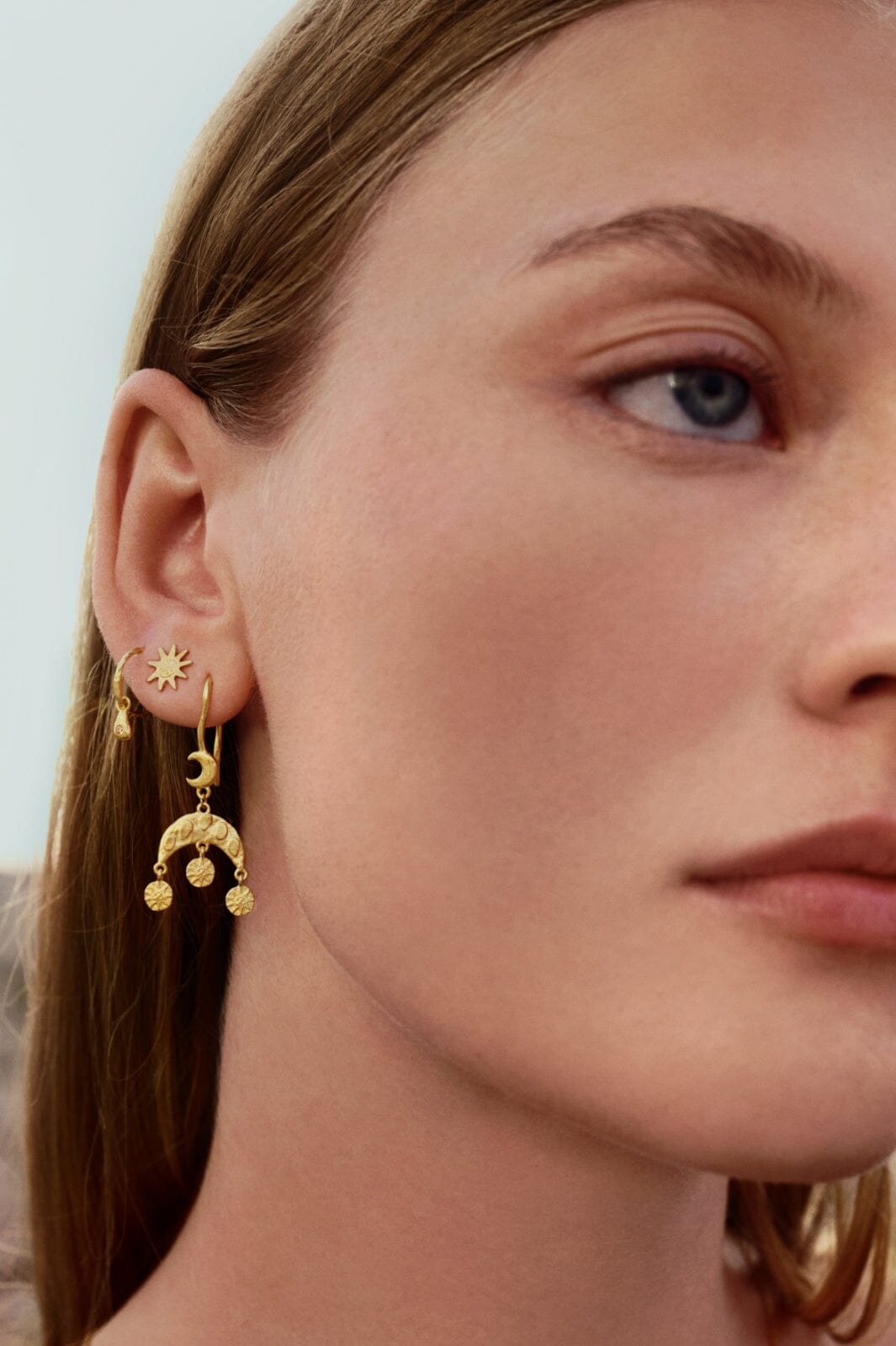 Gouden oorbellen van Maanesten met een ontwerp van zon en maan. Ze zijn gemaakt van gerecycled sterling zilver met een laagje van 18 karaat goud.
