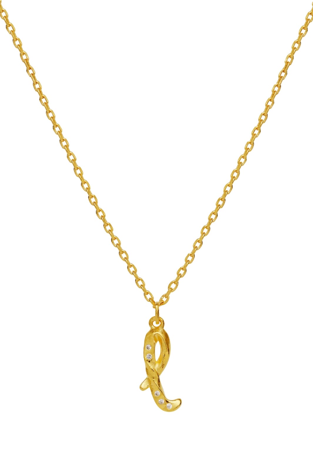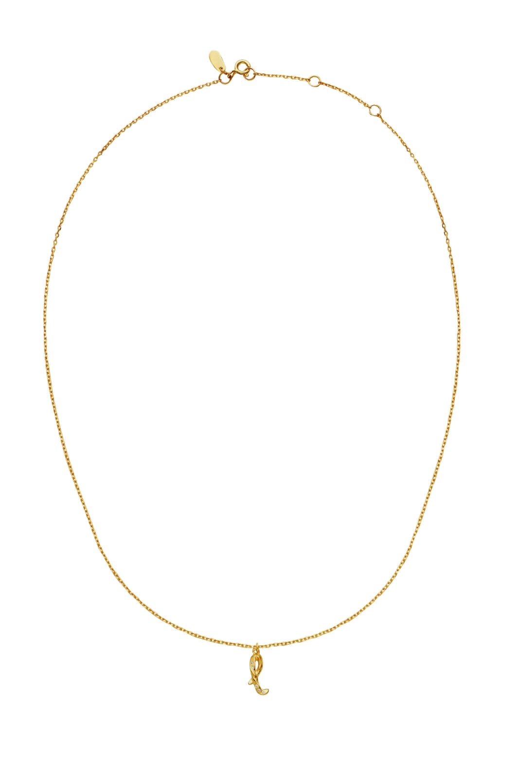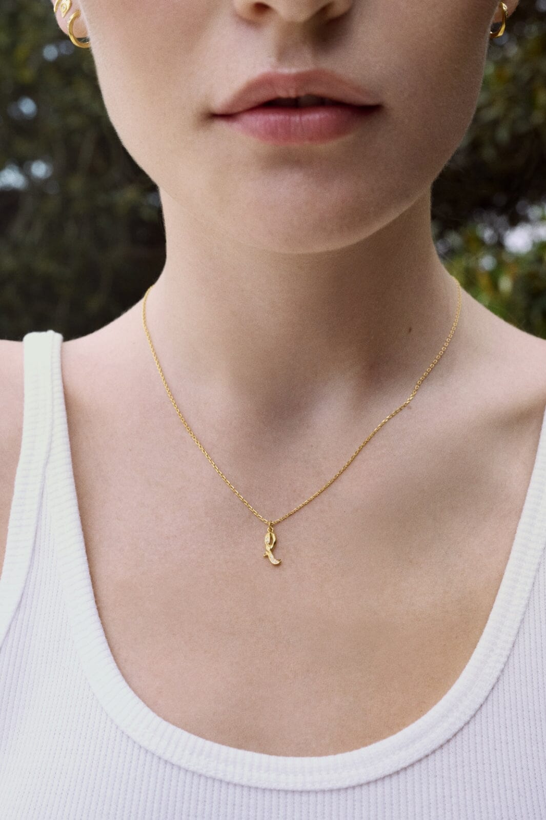 Gouden ketting van Maanesten met een L-vormige hanger. De ketting is gemaakt van gerecycled sterling zilver met 18 karaats goudlaag, wat het sieraad een warme gouden kleur geeft.