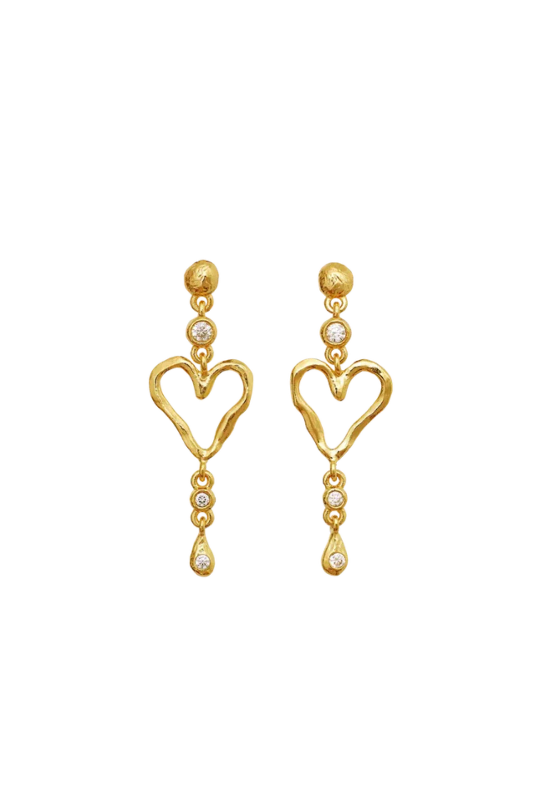 Oorbellen van Maanesten, gemaakt van gerecycled sterlingzilver met een laagje 18-karaats goud. Het hartvormige design heeft witte zirkonia’s langs de ketting.
