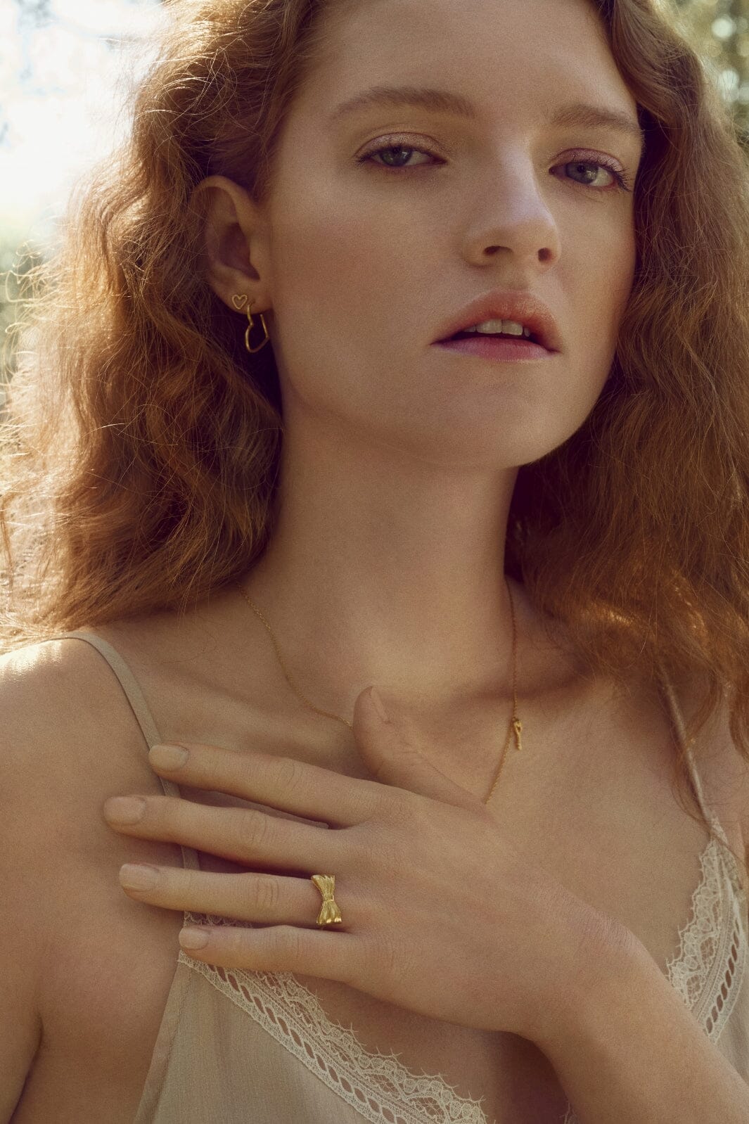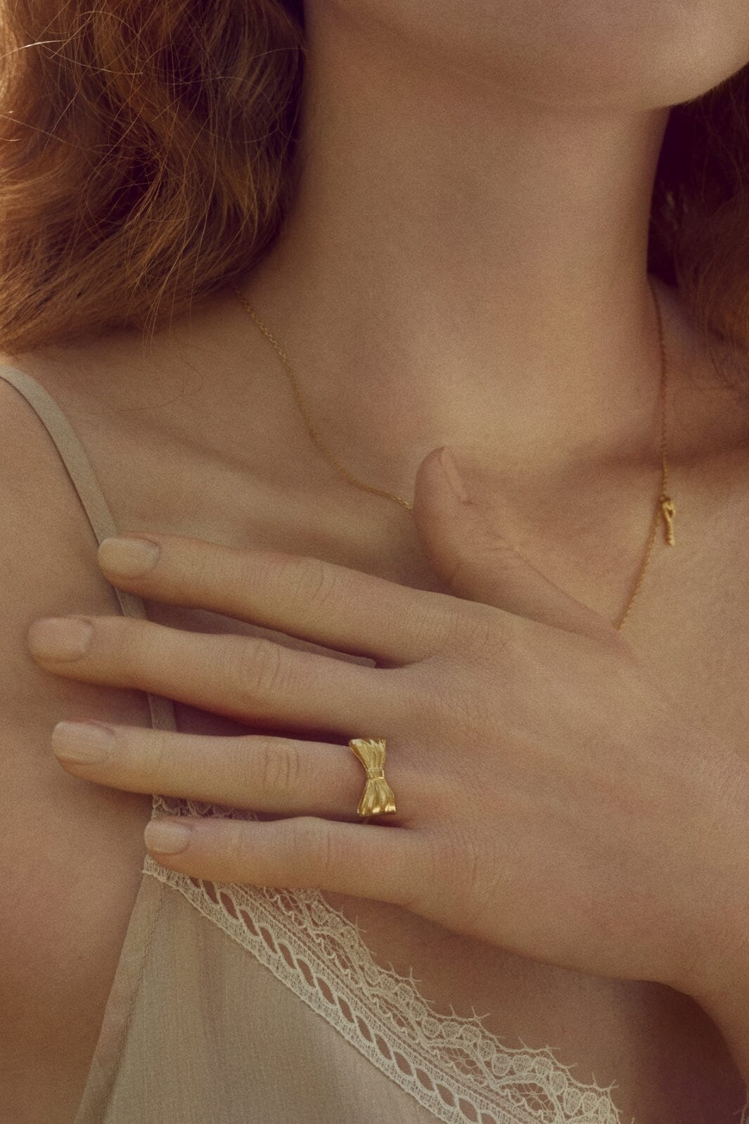 Goudgeplateerde ring van Maanesten met strikontwerp. De ring is gemaakt van gerecycled sterling zilver met 18 karaat goudplating, wat een warme gouden afwerking geeft.