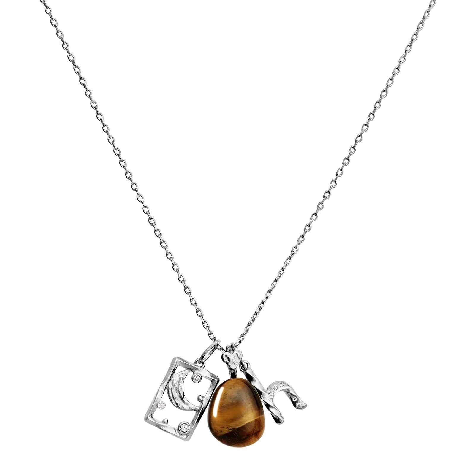 Hanger van Maanesten met een druppelvormige tijgeroogsteen in goud- en bruintinten. De steen heeft een gestreept patroon en een glad oppervlak. De hanger heeft een hartvormige ophanging.