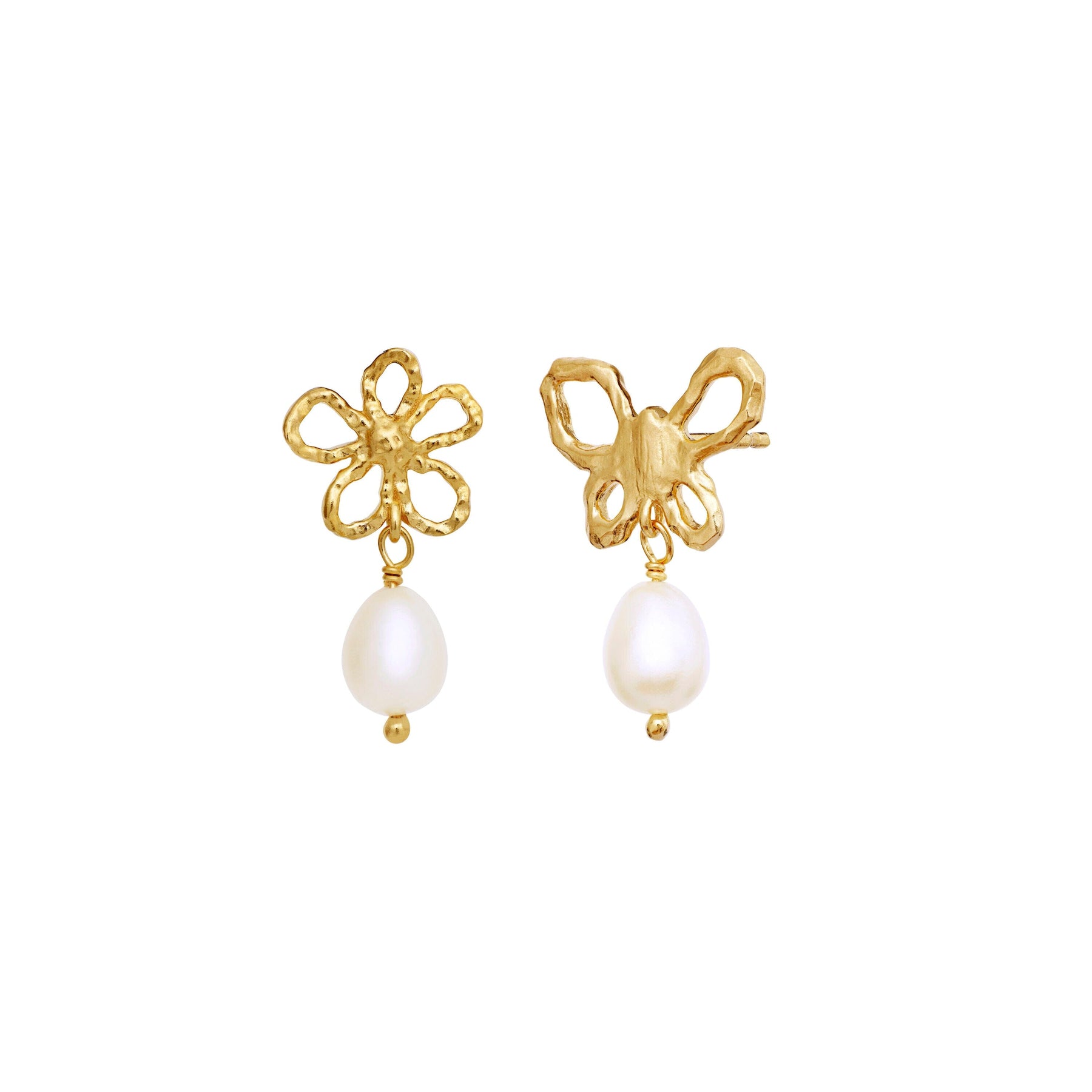 Oorbellen van Maanesten met een bloem- en vlindervormige bovenkant in goud en een witte parel die aan elke oorbel hangt.