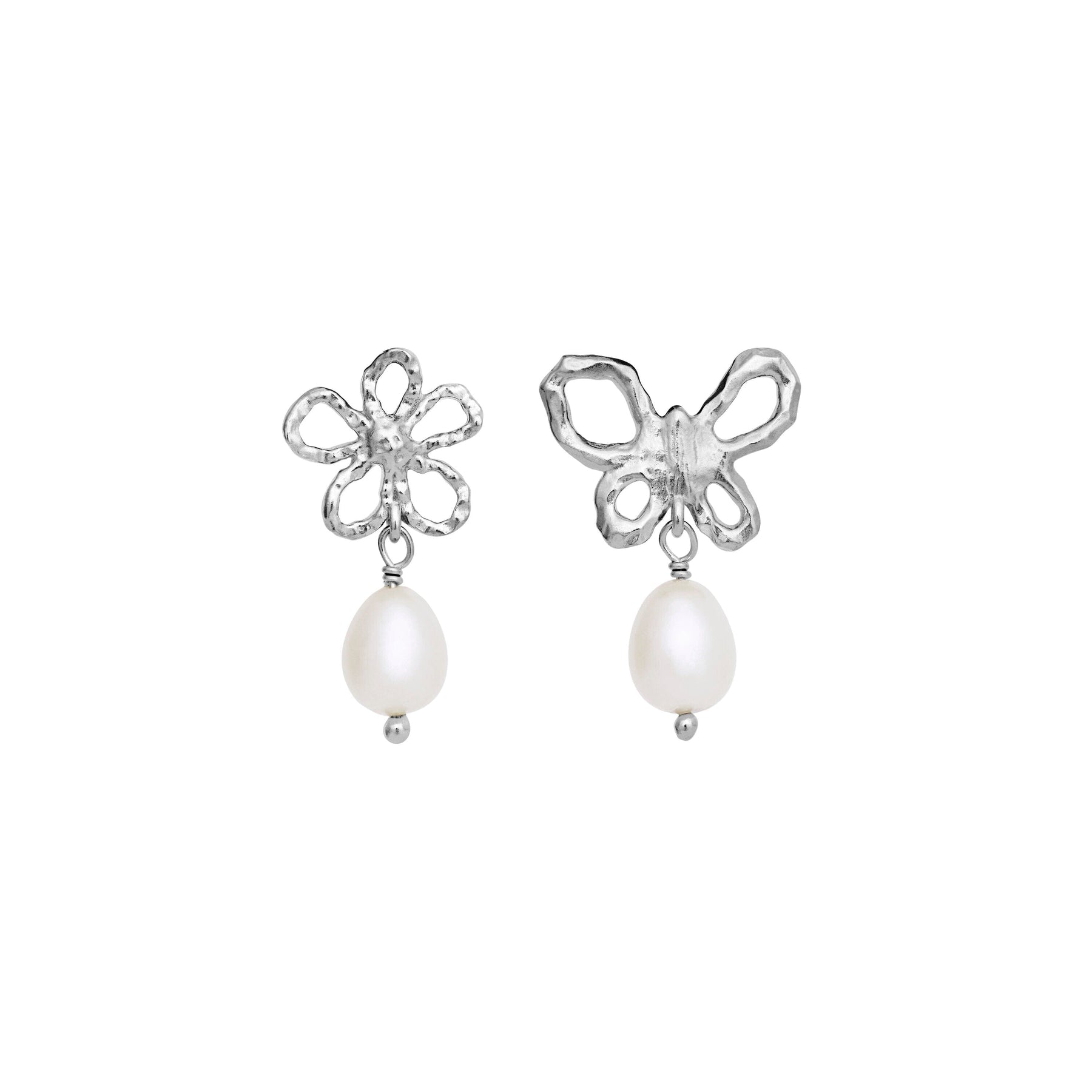 Oorbellen van Maanesten, gemaakt van gerecycled sterlingzilver. De ene heeft een bloemvormige bovenkant, terwijl de andere een vlindervormige bovenkant met hangende kralen heeft.