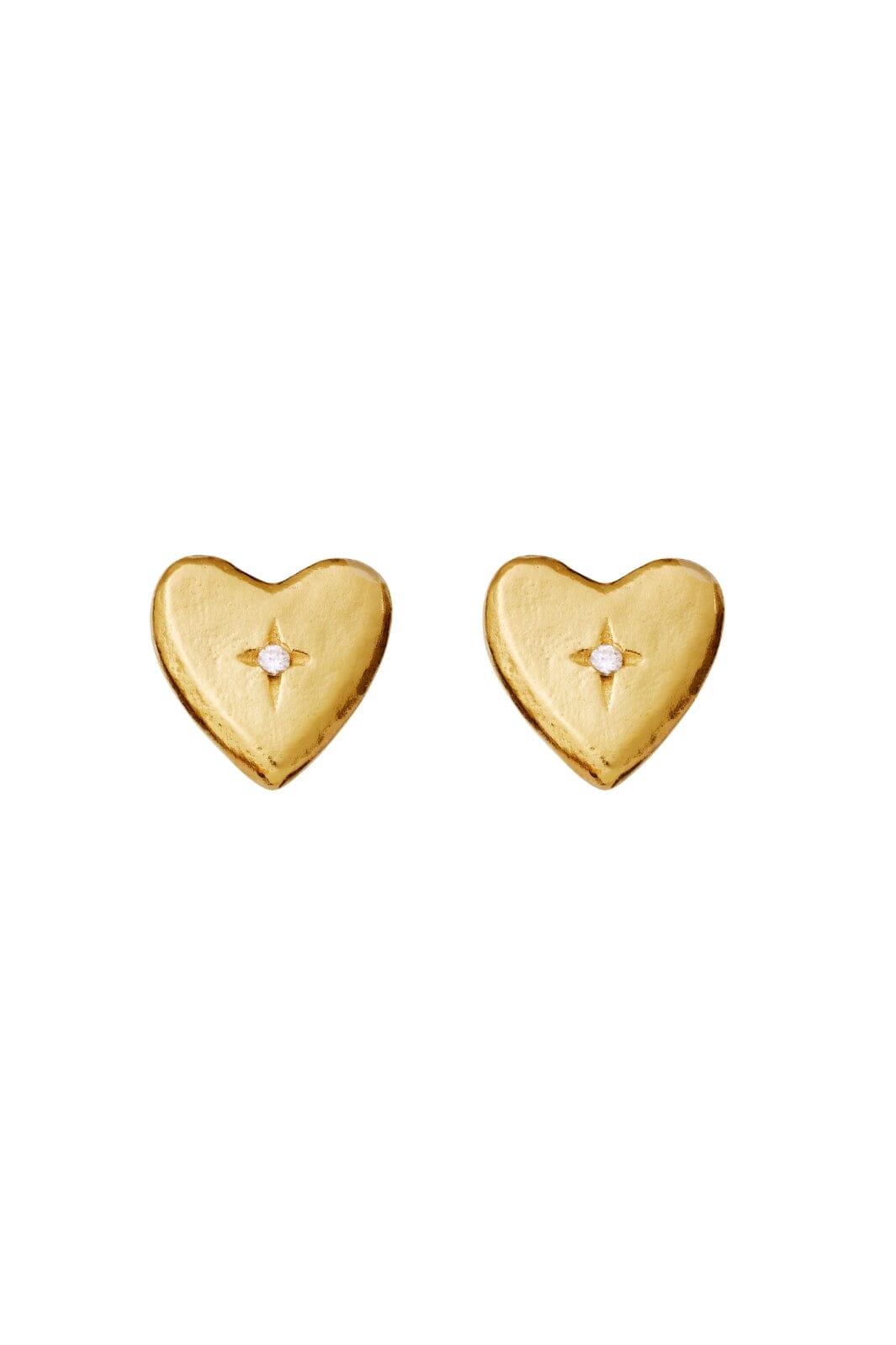 Hartvormige oorbellen van Maanesten met een klein kristaldetail in het midden. De kleine oorbellen hebben een compacte maat van 6 x 6 mm en zijn vervaardigd met een lichte constructie.
