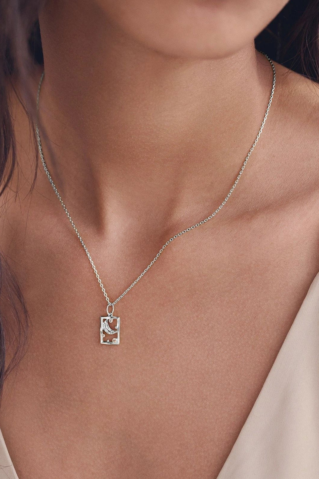 Hanger van Maanesten, gemaakt van gerecycled sterlingzilver in zilverkleur. De hanger heeft een rechthoekig frame met een halve maan en kleine cirkelvormige elementen.