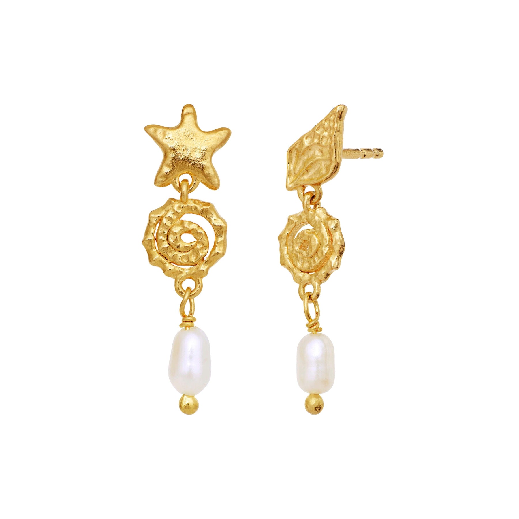 Oorbellen van Maanesten met een stervormige en bladvormige steker. Ze hebben gedraaide details in het midden en ovale parels die onderaan hangen.