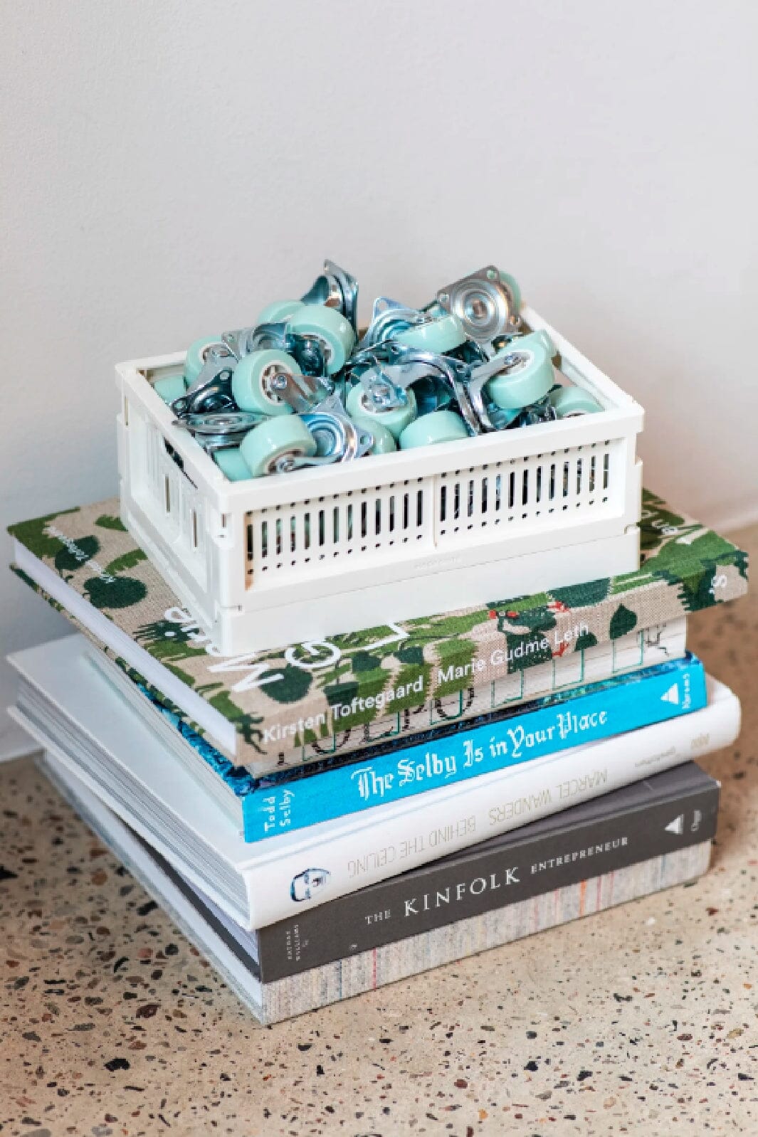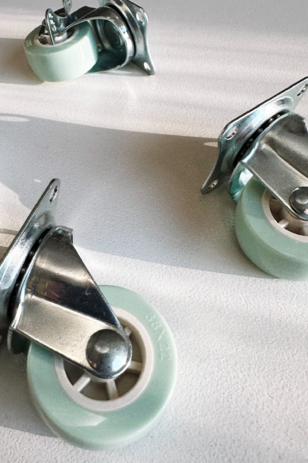 Wielen van Made Crate in een mintgroene tint met zilverkleurige metaaldetails. Ze zijn ontworpen als accessoires voor Made Crate-opbergdozen en bieden gemakkelijke mobiliteit in huis.