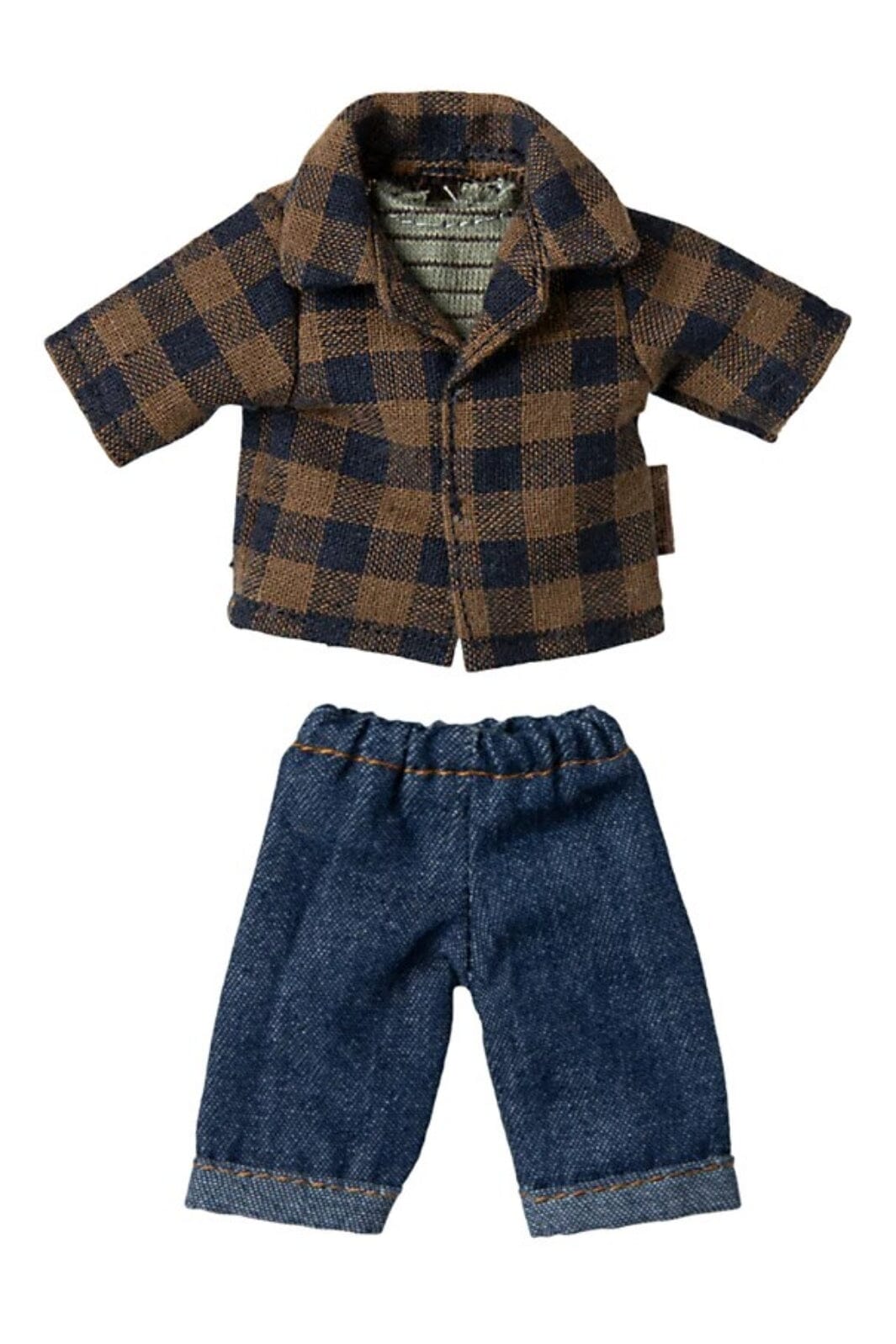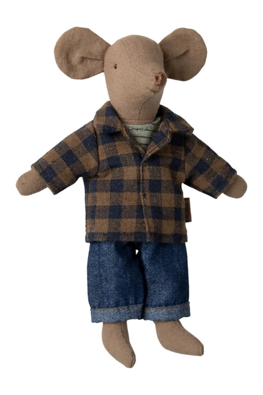 Een lichtbruine muis van Maileg met grote oren en eenvoudige gelaatskenmerken. De muis heeft een geruit shirt, een tanktop en denim broeken met opgerolde pijpen.