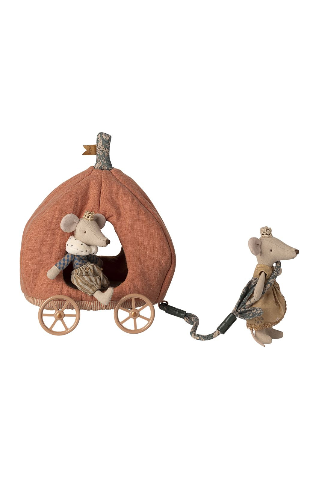 Een pompoenvormige wagen van Maileg voor muisfiguren. De wagen heeft vier wielen en een trektouw met bloemmotief, waardoor de wagen kan worden voortgetrokken.