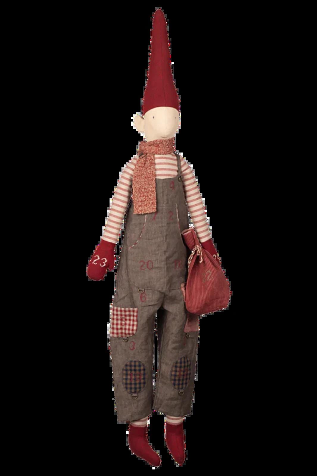 Grijze kalenderkabouter van Maileg met een gestreepte trui en een overall met cijfers. De 121 cm hoge kabouter heeft een rode muts en kan worden opgehangen met het lusje in de nek.