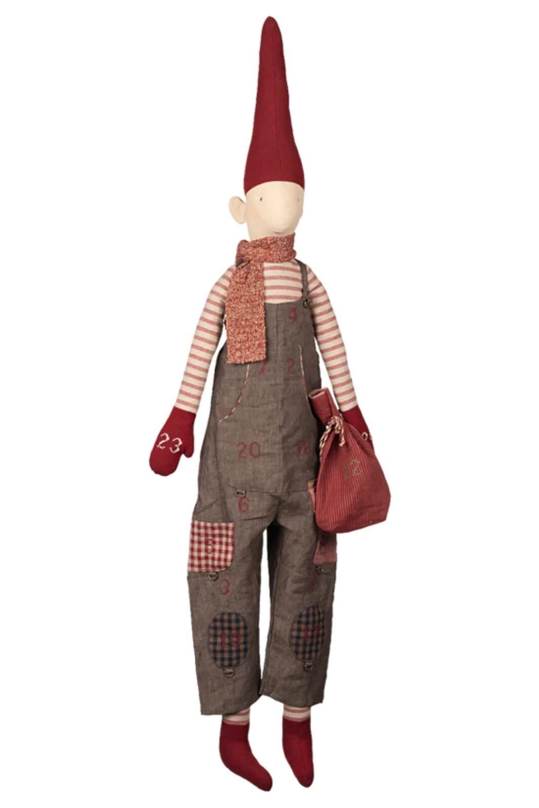 Grijze kalenderkabouter van Maileg met een gestreepte trui en een overall met cijfers. De 121 cm hoge kabouter heeft een rode muts en kan worden opgehangen met het lusje in de nek.