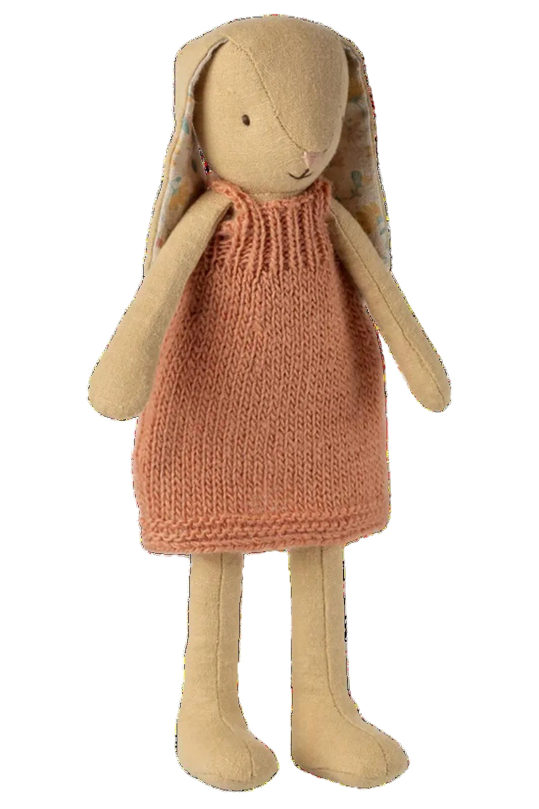 Een konijn van Maileg met een gebreide jurk in een roze-bruine tint. Het konijn heeft lange hangoren met een meerkleurig patroon aan de binnenkant en een licht crèmegele vacht.