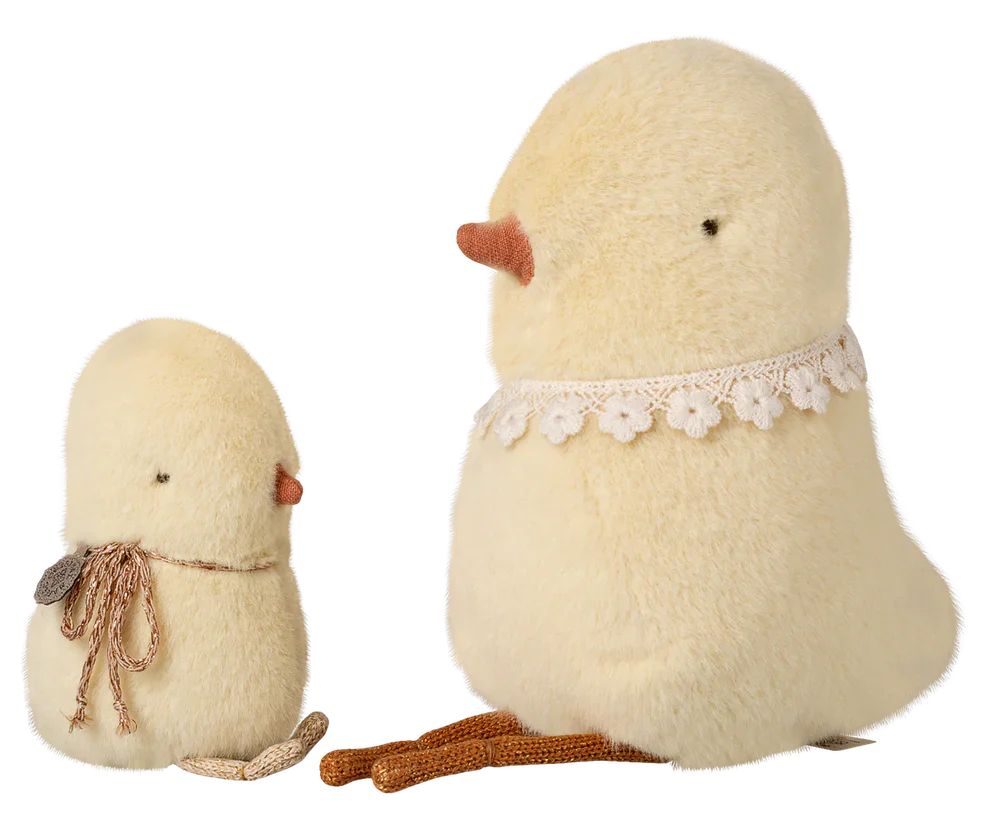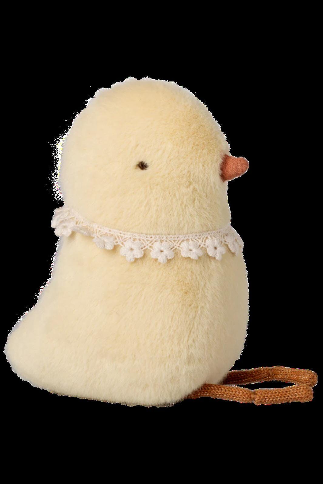 Een klein pluchen kuikentje van Maileg in lichte kleuren met een decoratieve kanten kraag rond de hals.
