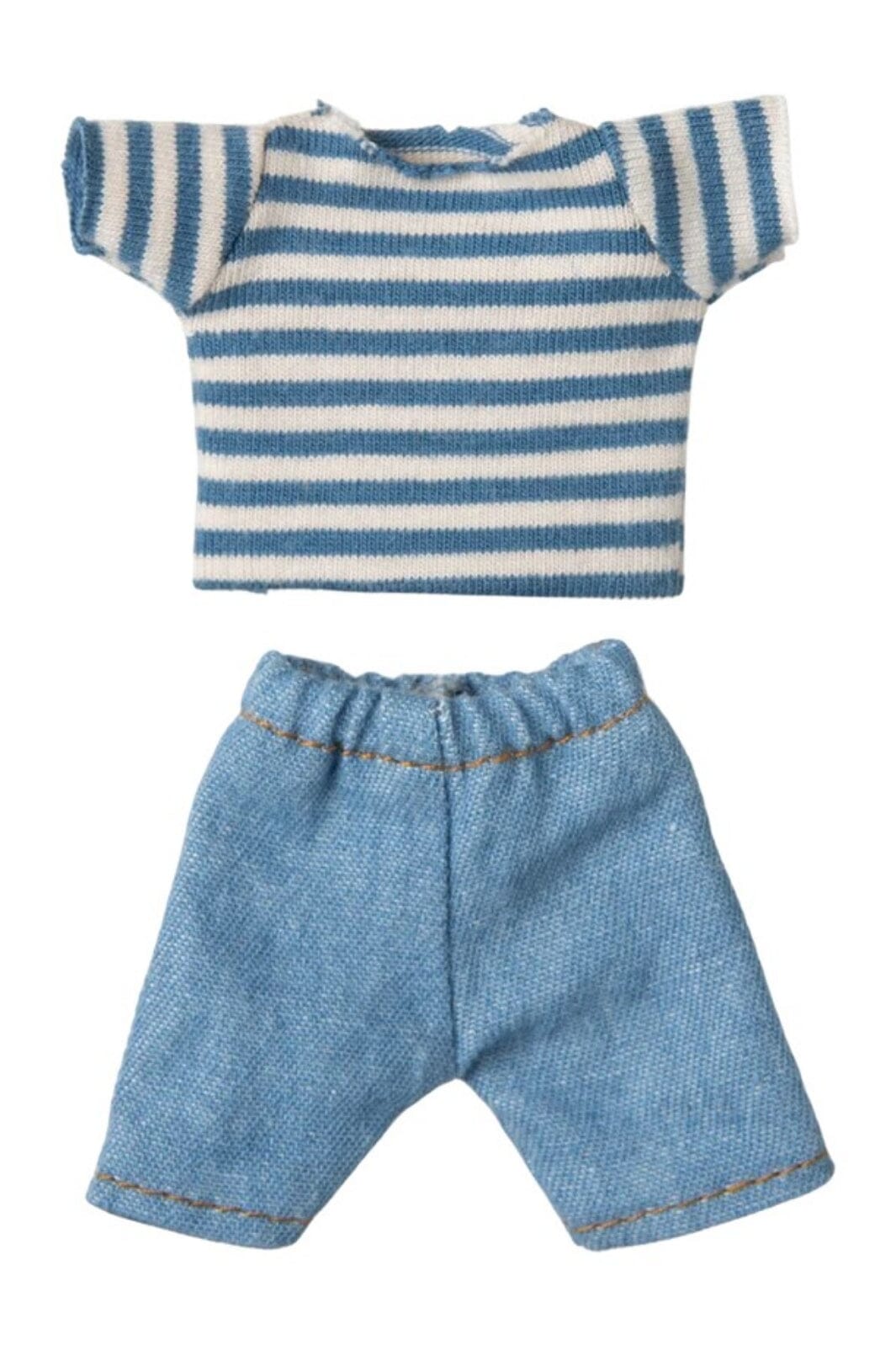 Een zachte stoffen muis van Maileg met magneten in de handen. Ze komt in een decoratieve doos en is gekleed in een blauwgestreept T-shirt en denim broek.