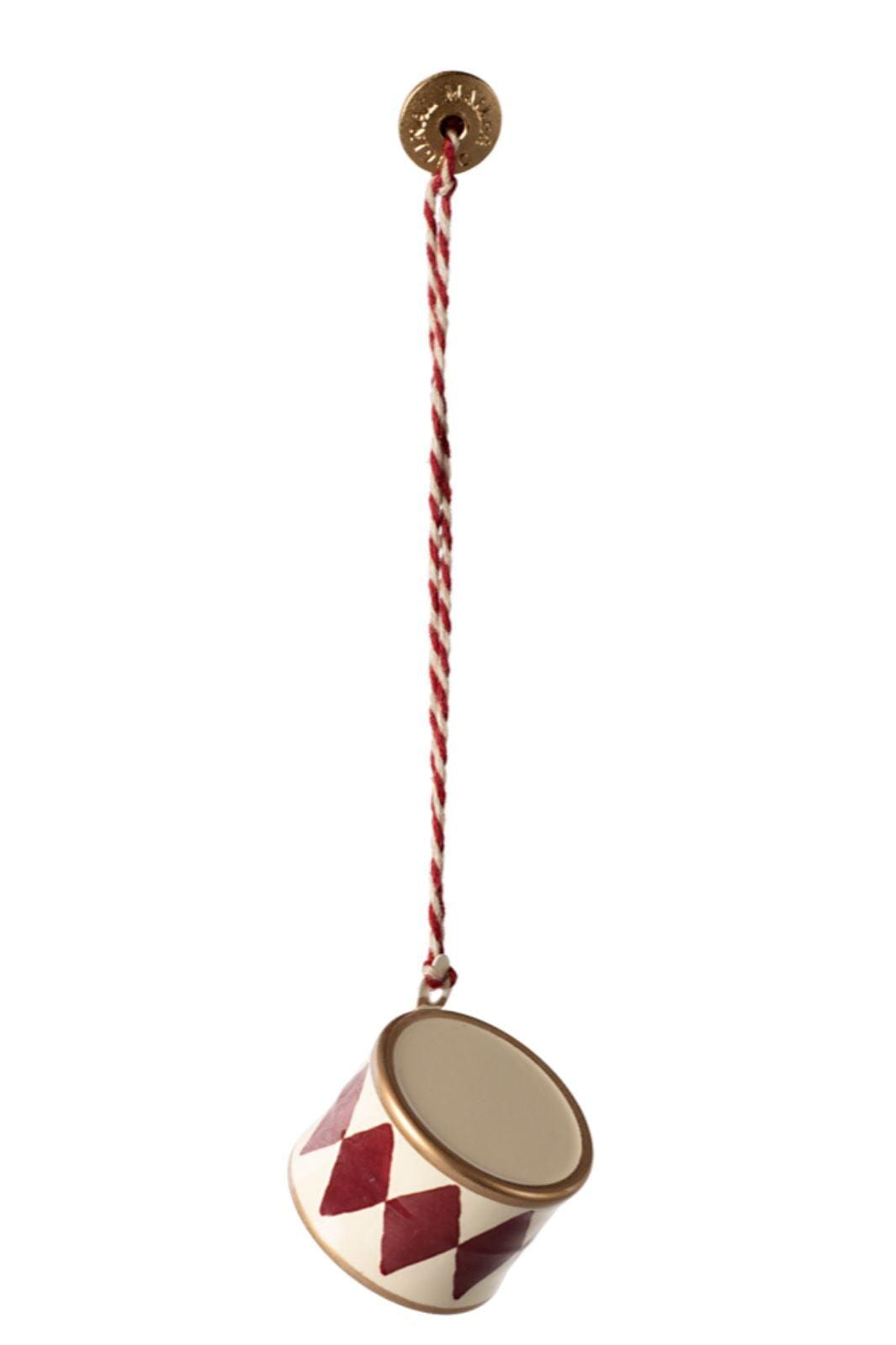 Kleine metalen hanger in trommelvorm van Maileg met een rood-wit ruitpatroon. Gemaakt van metaal met handgeschilderde details en een gedraaide ophangkoord.