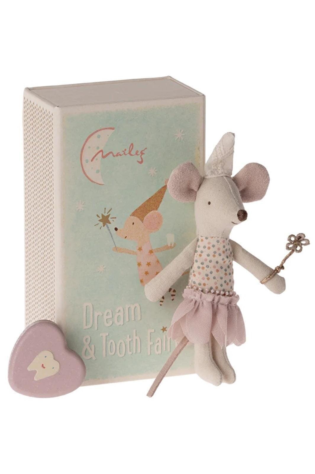Een tandfee-muis van Maileg in een luciferdoosje. De muis heeft een gestreepte jurk en een toverstaf, en de doos fungeert als bed. Een roze hartvormige houder wordt meegeleverd.
