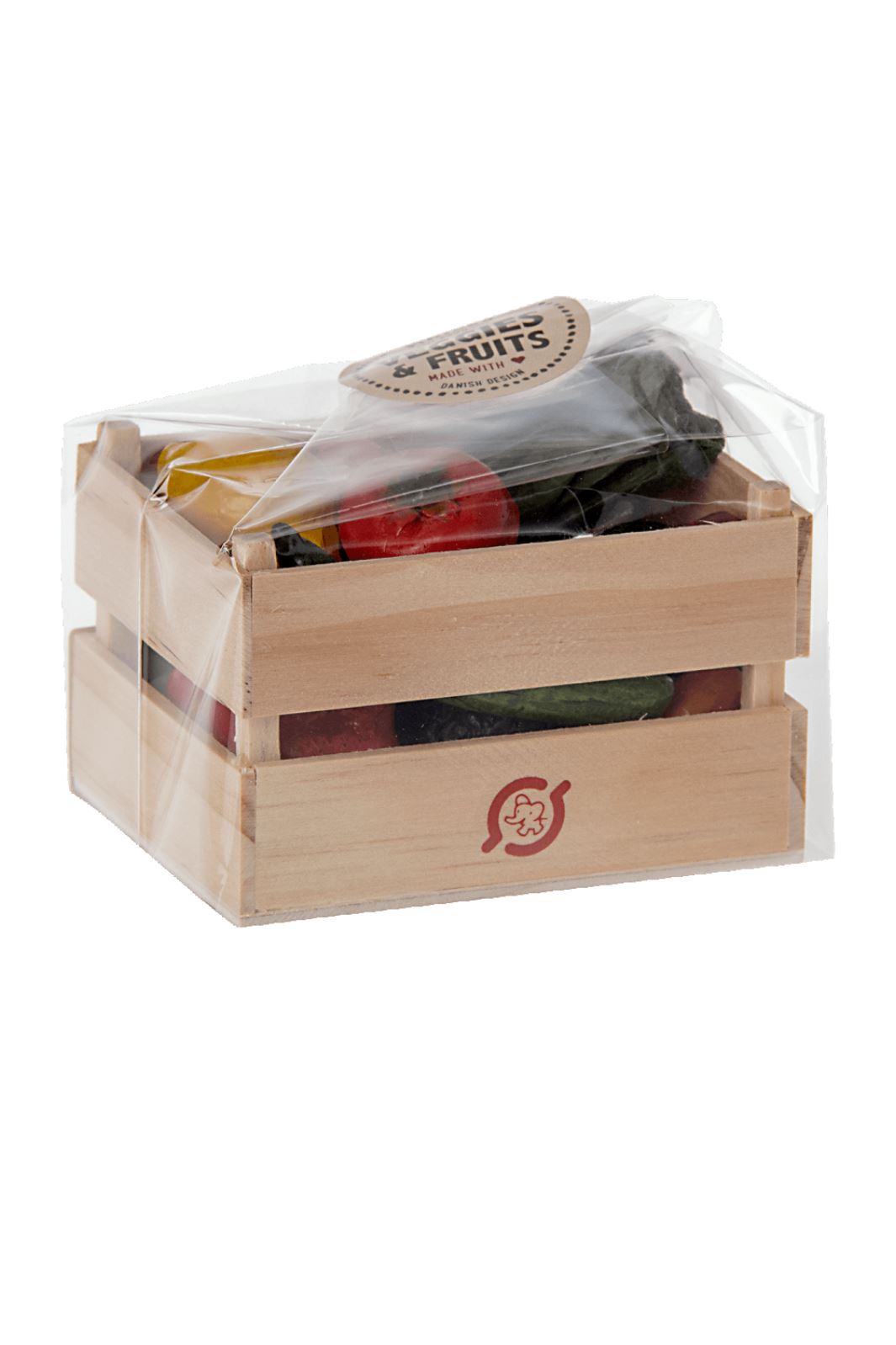 Speelgoedgroenten en -fruit van Maileg in een houten kist. De natuurgetrouwe groenten en fruit zijn gemaakt van duurzame materialen en hebben realistische details.