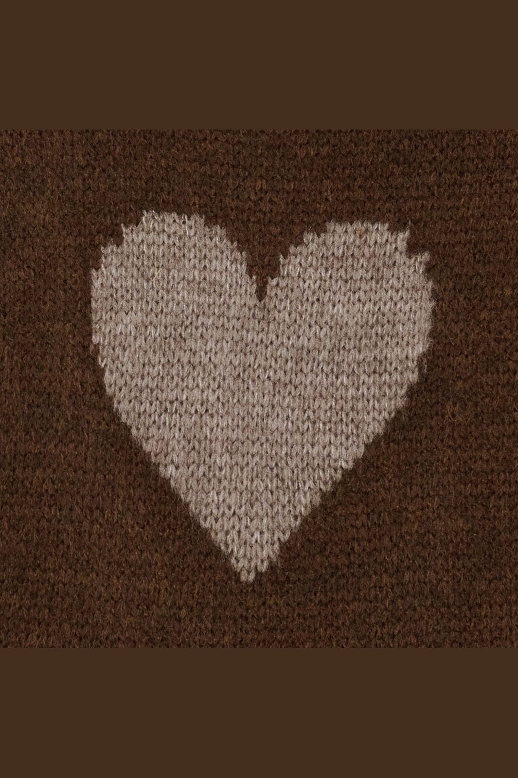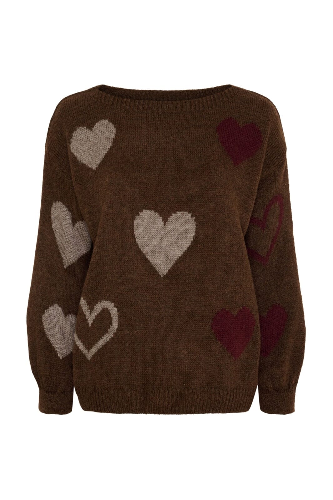 Bruine trui van Marta Du Chateau met hartvormige patronen aan de voorkant in grijs en bordeaux. De achterkant is effen bruin zonder patronen.