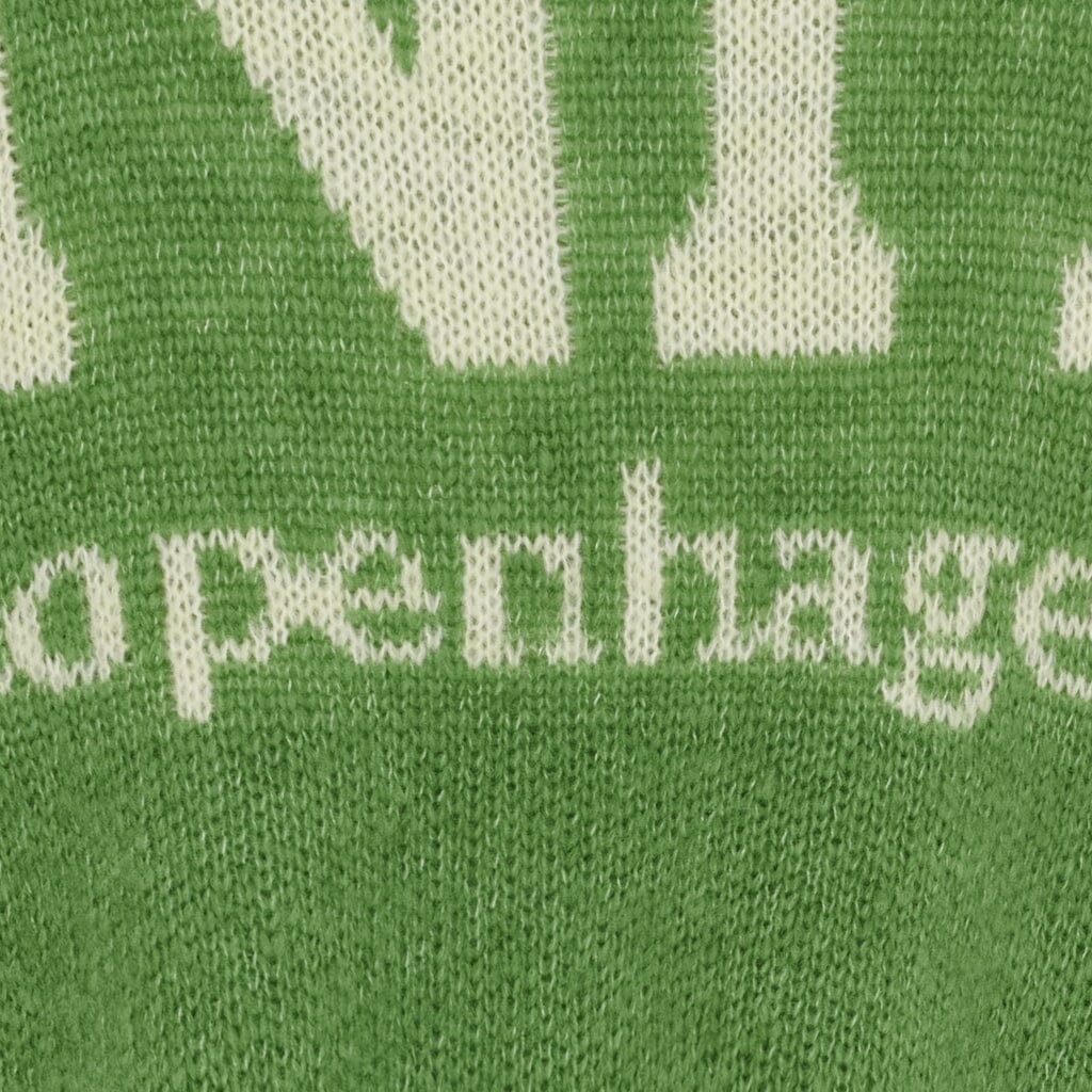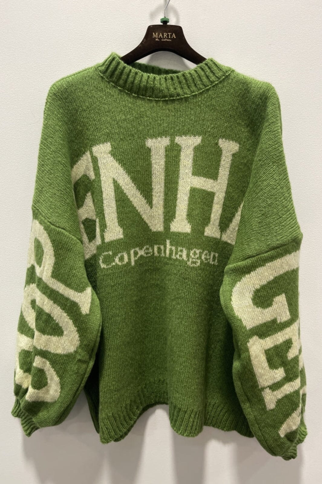 Groene gebreide trui van Marta Du Chateau met witte COPENHAGEN-print. De trui heeft een oversized pasvorm en lange mouwen voor casual gebruik.