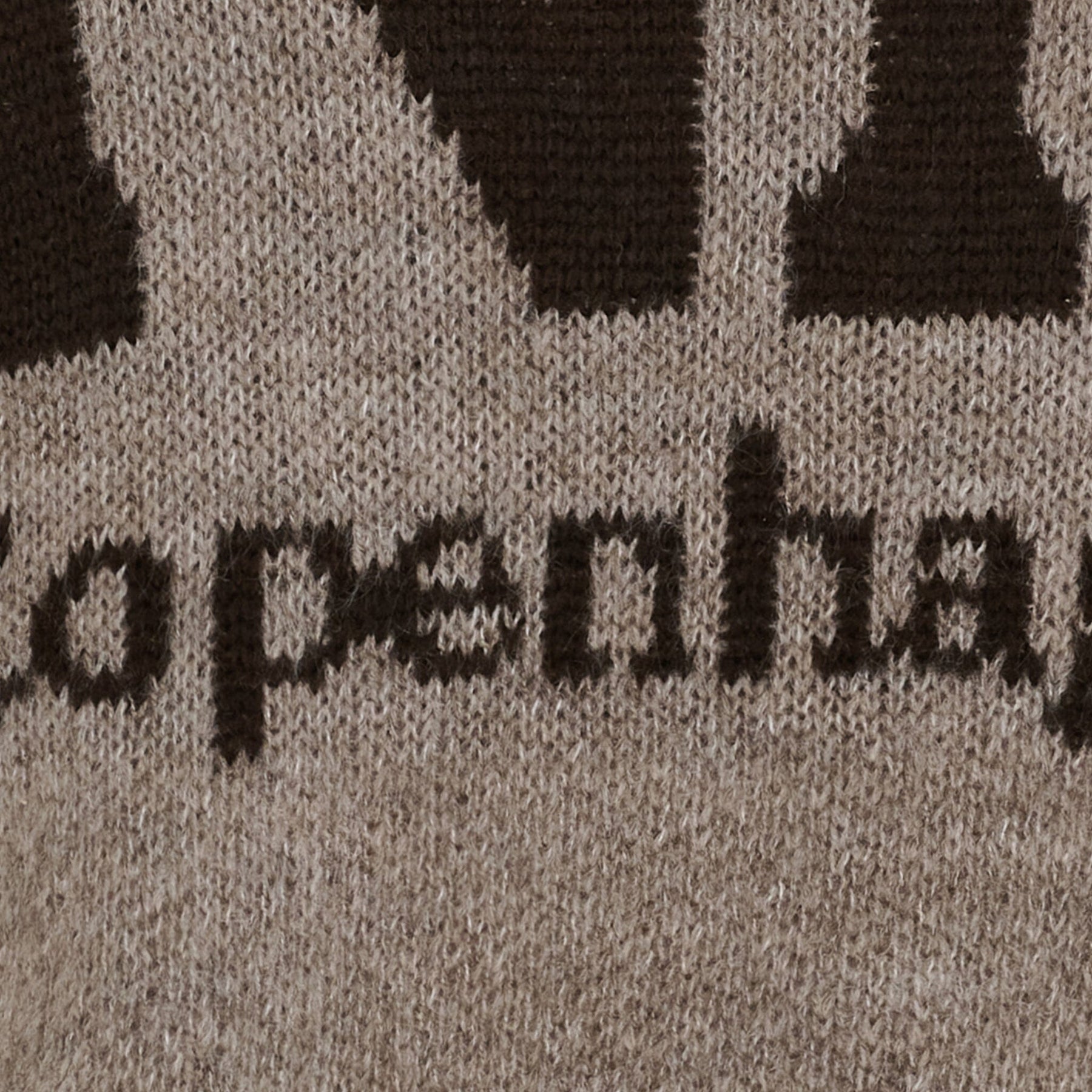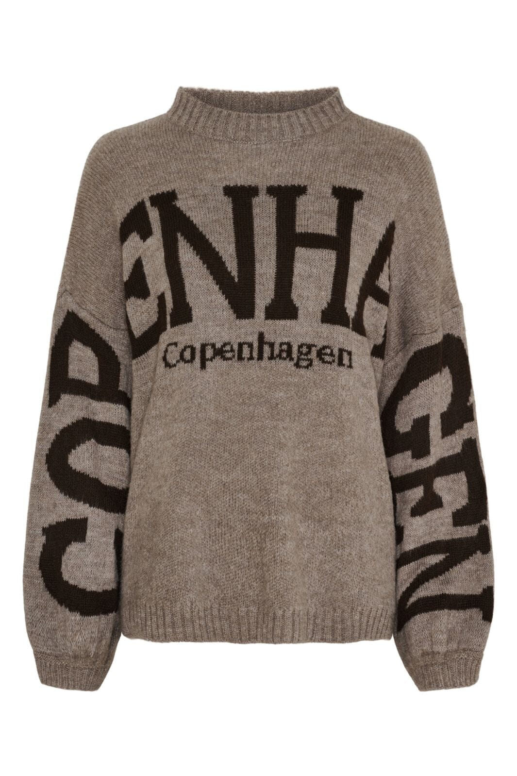 Gebreide trui van Marta Du Chateau in een donkere bruine tint met grote Copenhagen-print op de voorkant en mouwen. De trui heeft een oversized pasvorm en een ronde halslijn.