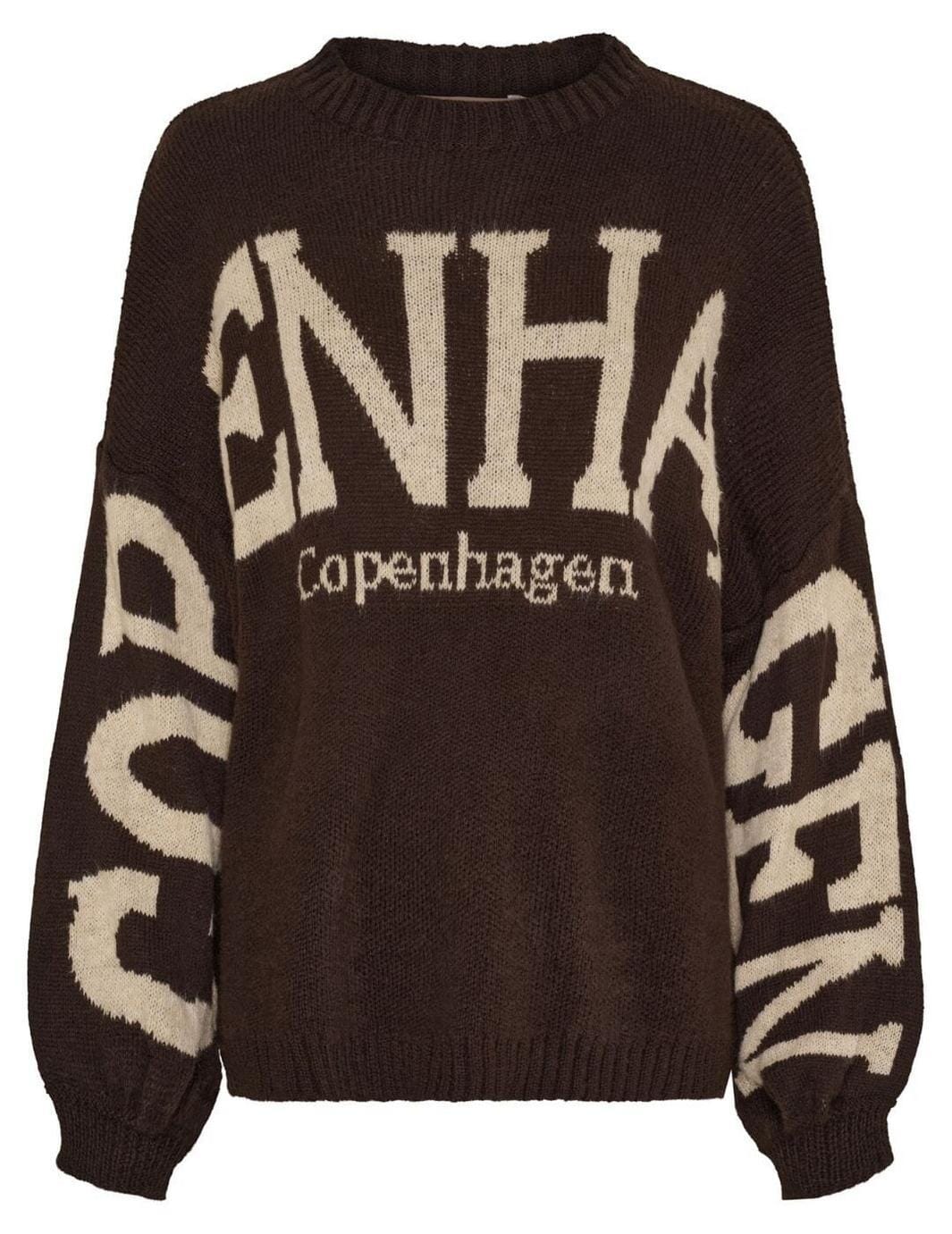 Donkerbruine trui van Marta Du Chateau met een bedrukt tekstontwerp in beige. De trui heeft een oversized pasvorm en een ronde halslijn.