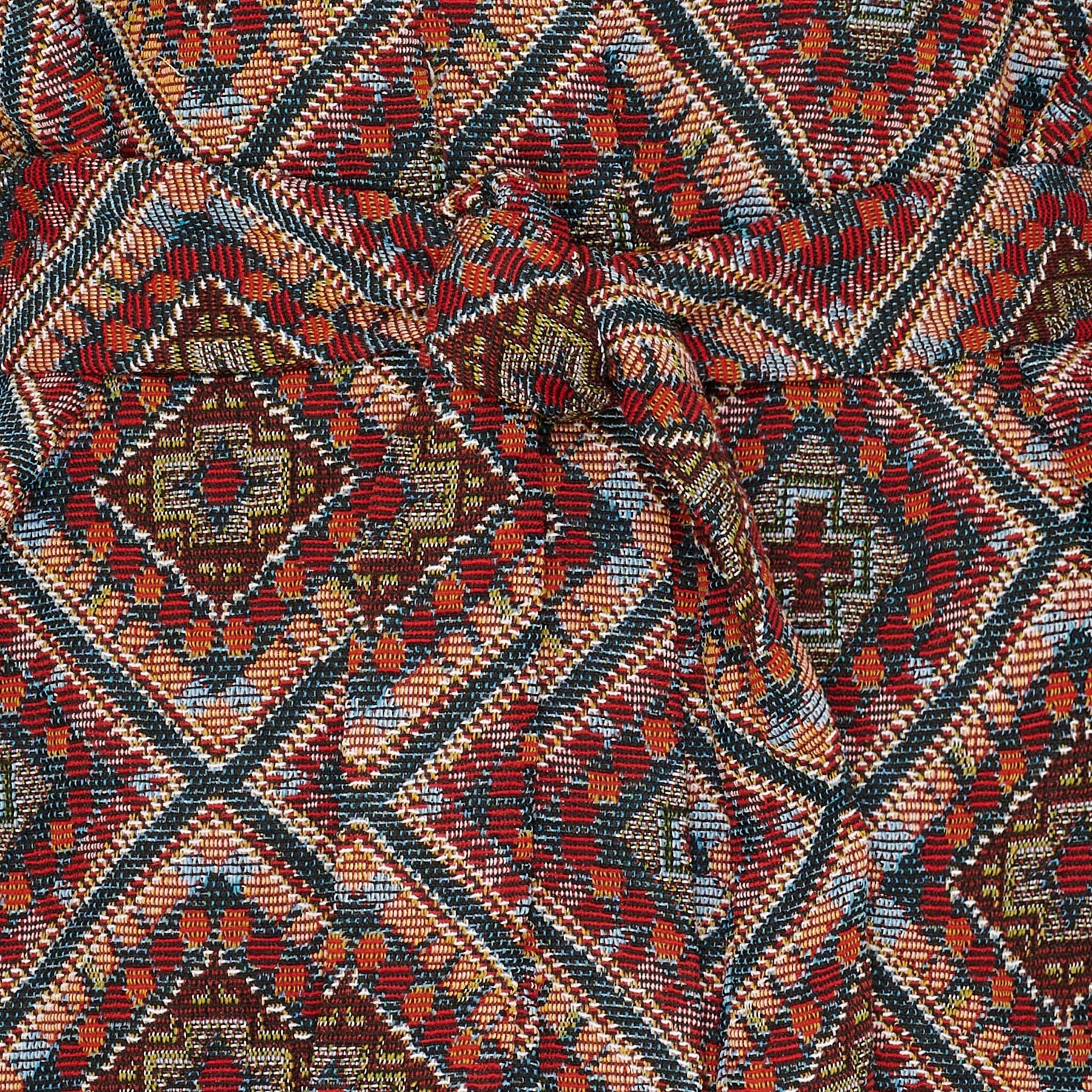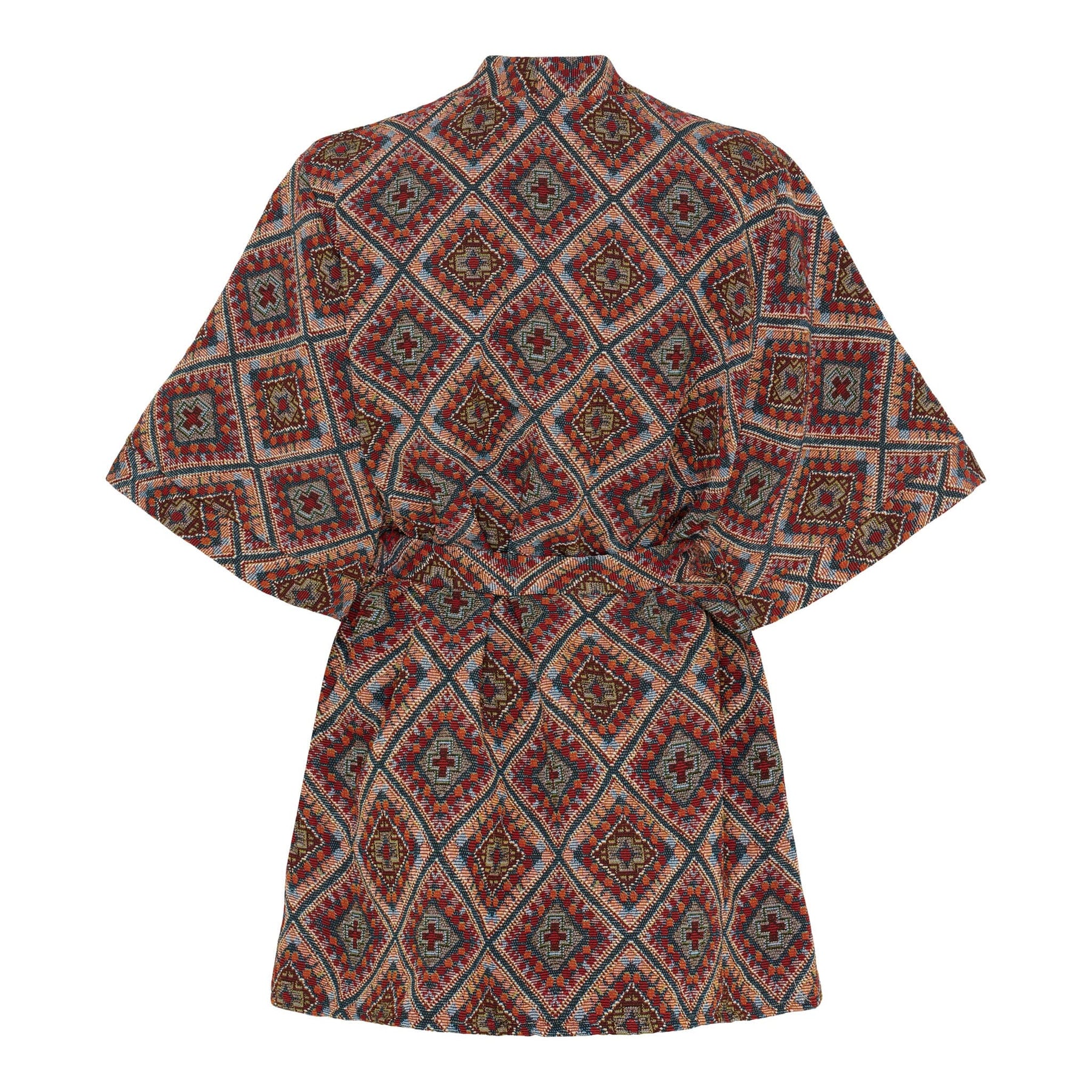 Kimono van Marta Du Chateau met een geometrisch patroon in bordeaux, marine en oranje tinten. De wijde mouwen en de losse snit zorgen voor een relaxte pasvorm met veel bewegingsvrijheid.