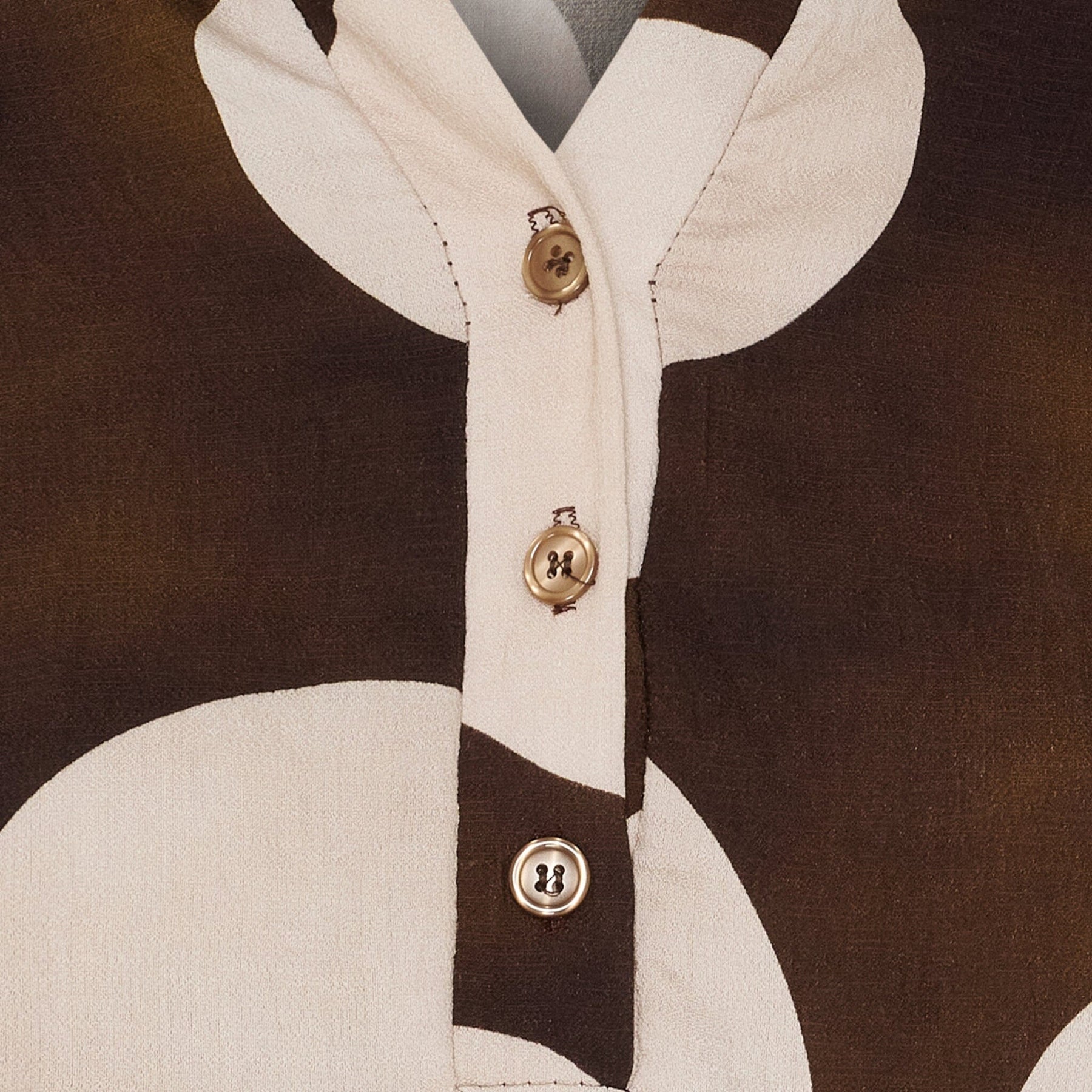 Bruin overhemd van Marta Du Chateau met grote lichte stippen op een donkere achtergrond. Het overhemd heeft een klassieke overhemdkraag en een losse pasvorm met lange mouwen en knoopsluiting aan de voorkant.