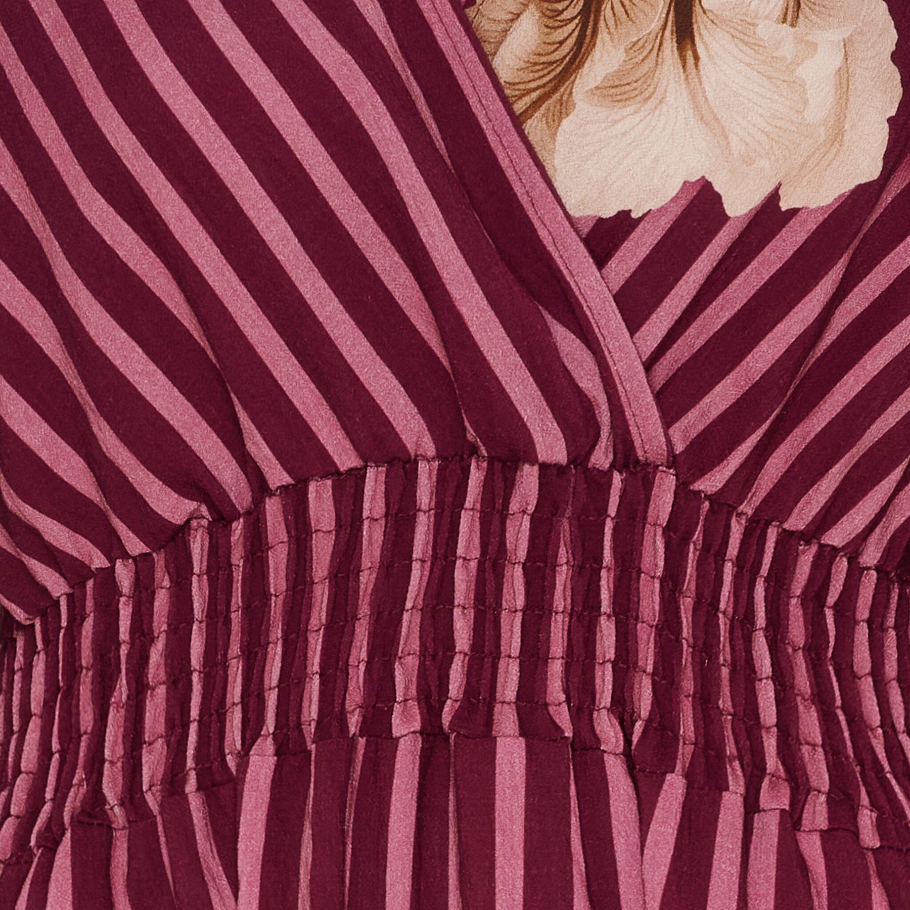 Knielange jurk van Marta Du Chateau in bordeaux met bloemenpatroon en verticale strepen. Hij heeft een V-hals, elastiek in de taille en lange mouwen met elastiek bij de polsen.